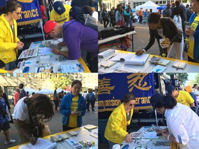 虽然布鲁克林的大集市一年只有一次,但是法轮功给民众留下了深刻的印象。有一位西人女士在人群中喊道:“我每年都会来要一朵法轮功的小莲花挂在家里,我感到这个小莲花可以给我能量!”一位叫做Matthew的先生同他的朋友们一起直奔展位而来,直接要求签字支持反迫害,他们说他们了解一切真相。