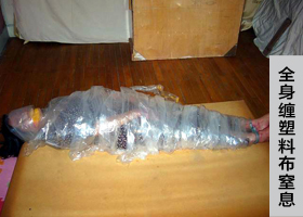 监狱队长指使看管犯用最脏的抹布塞进我口中,然后用封箱带把我的嘴、耳朵、整个头部一层层都封起来,双腿、双脚也用封箱带层层绑住……