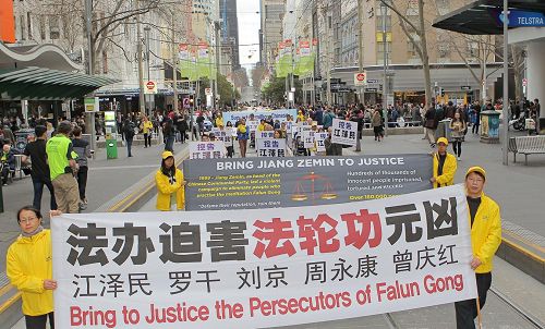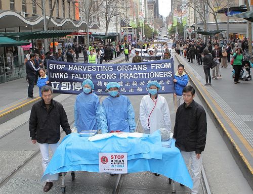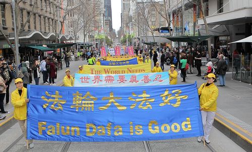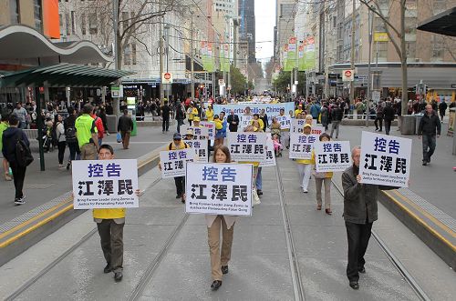 长逾千米的游行队伍分为“法轮大法好”、“停止迫害法轮功”、“控告迫害元凶江泽民”三个大的方阵,在天国乐团的引领下横贯墨尔本闹市区,过往民众见此景象或停下脚步拍照、或向沿途派发资料的法轮功学员拿取更多信息,或询问学员更多真相。一名男子接过活摘器官的真相资料后大声说:“活摘器官,全澳洲人都会反对。”