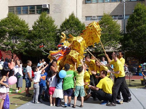 【明慧网二零一六年九月六日】二零一六年九月三日,纽约华埠罗斯福公园鼓声阵阵、金龙祥狮起舞,热闹非凡。法轮功学员在此举办贺中秋联欢会,现场观众兴致极高,掌声不断,派送的写着“法轮大法好”的小莲花饰品,更被观众一抢而光。