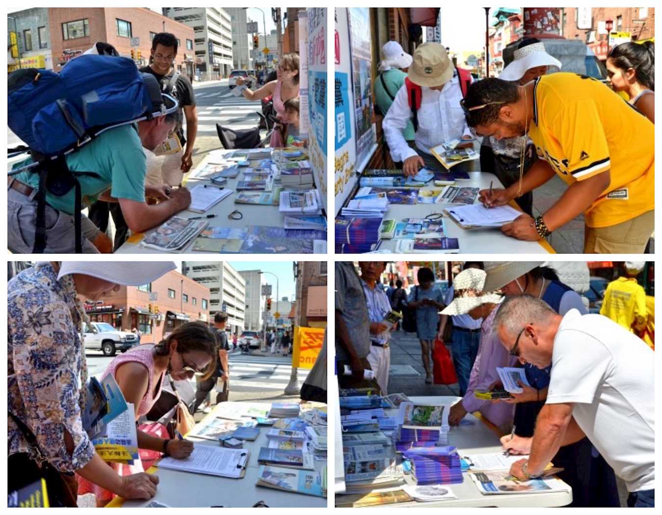 二零一六年八月二十七日,大费城地区部份法轮功学员在费城中国城再次举办讲真相活动,使越来越多的中、西方民众了解到江泽民利用中共国家机器迫害甚至活摘法轮功学员器官的反人类罪行,并纷纷在呼吁制止中共活摘法轮功学员器官的征签表上签名支持正义。