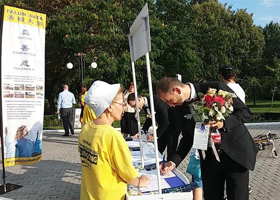2016年9月3日,法轮功学员们来到罗马尼亚特尔戈维什泰市(Targoviste)的Chindia公园举行征签活动。