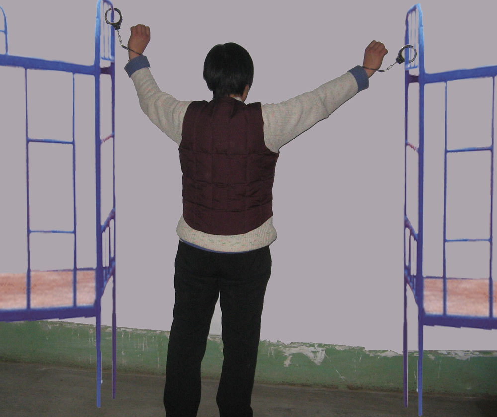 ![]() 中共酷刑示意图:铐在床架上罚站 |