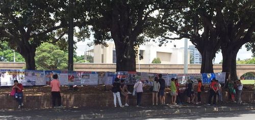邹女士还表示,一些散客都会主动过来讲给我听一些大陆目前发生的情况,我和他们交流之后也让他们明白了为啥“三退保平安”的真相,他们也愿意做“三退”,有的游客主动来拿《九评》和其它真相资料;有的对着横幅拍照、带回去给亲朋好友看。