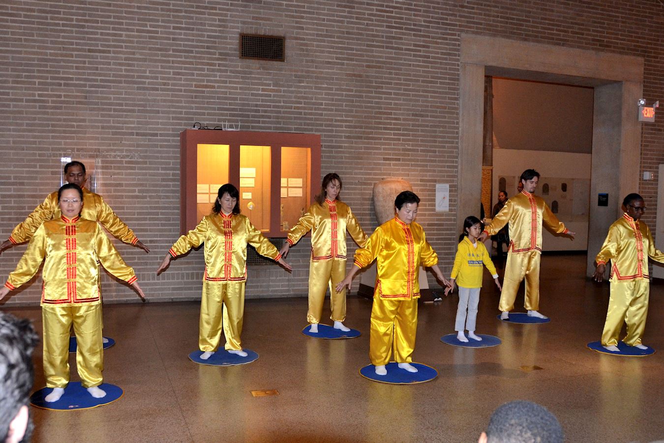 当天,这座著名的博物馆里熙熙攘攘,热闹非凡。一整天的各种活动丰富多彩,有音乐、舞蹈、书法表演、舞狮、武术、太极和法轮功功法演示、手工制作、儿童娱乐等。法轮功学员设立了展位,并由迎新年活动组织者安排做了功法演示,向民众介绍法轮功祛病健身、提升道德水平的神奇功效。学员还为西人观众展示了中国书法。法轮功展位前经常是挤满了人,功法演示也吸引了民众济济一堂学炼法轮功。