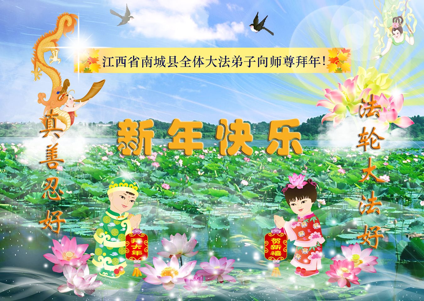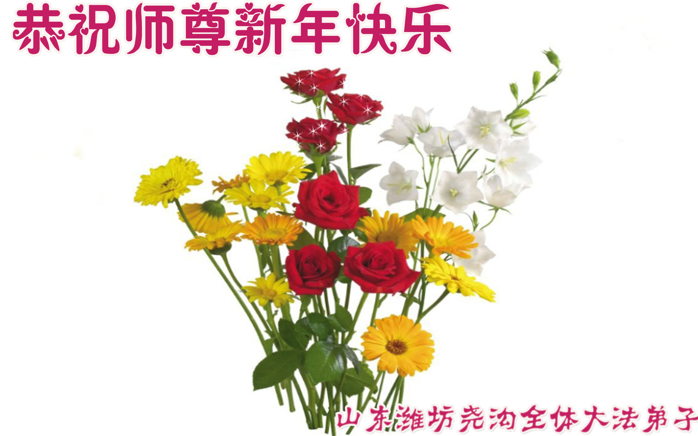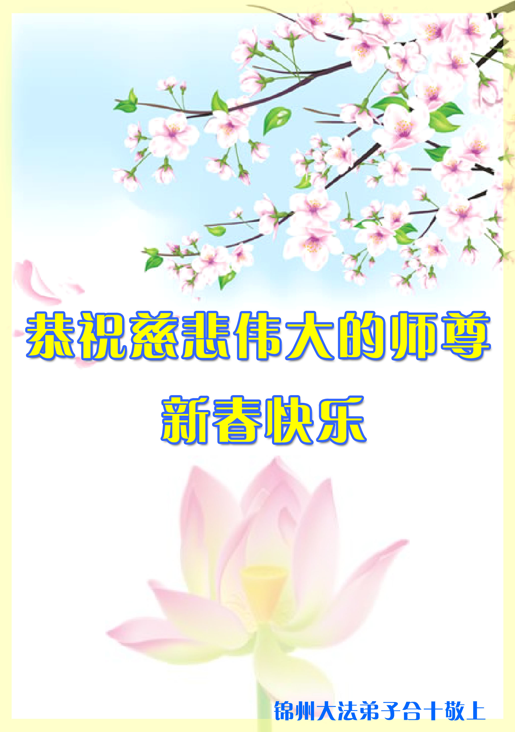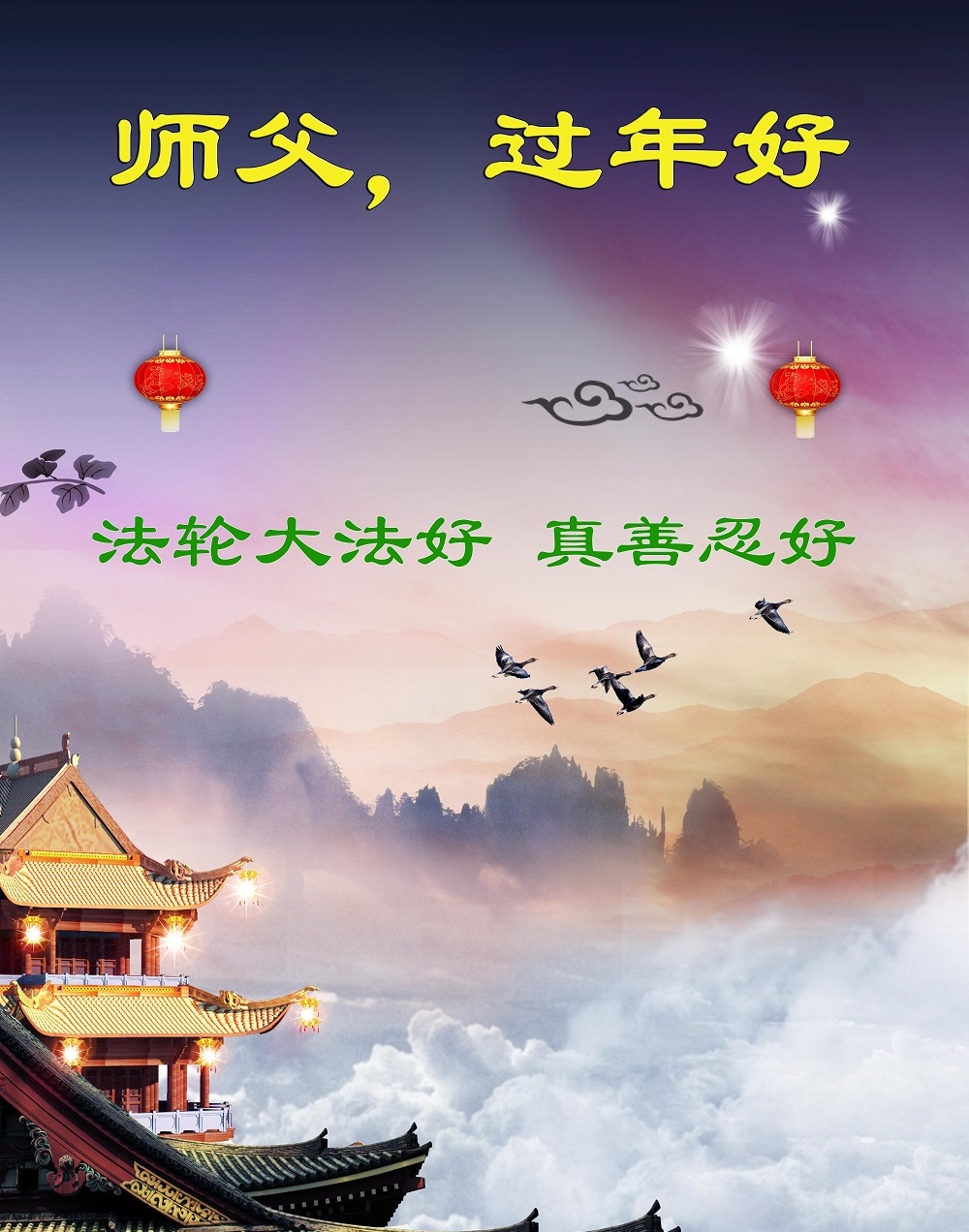 师父新年好!在师父的慈悲看护下,我们的资料点一直在发挥应有的作用,我们知道,我们能做好的每一件事情都是在师父的慈悲看护下完成的。对师父崇敬的心是用人类最美好的语言也无法表达完整的。在此新年到来之际,我们全体大法弟子用修炼人最纯净的心向师父问好!祝愿我们慈悲伟大的师父新年快乐!