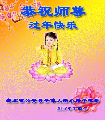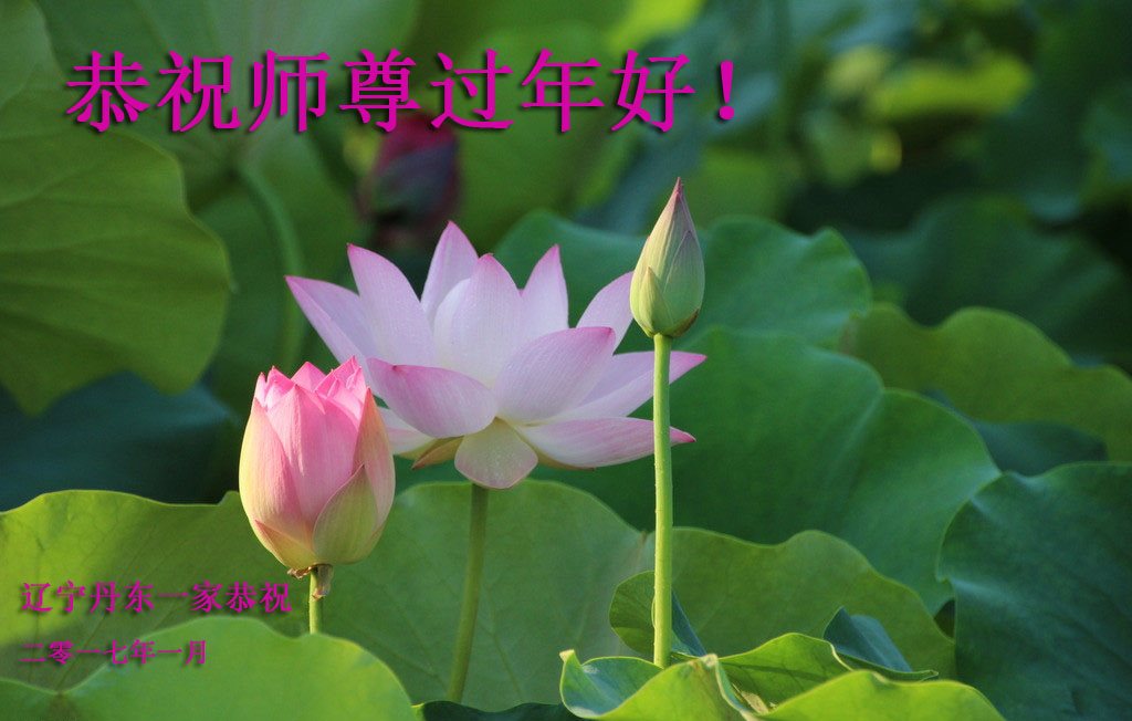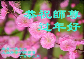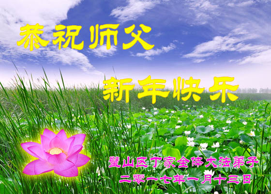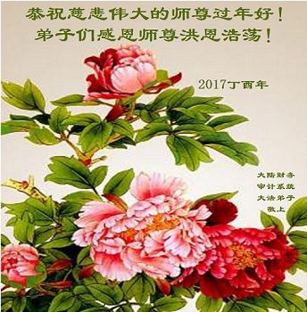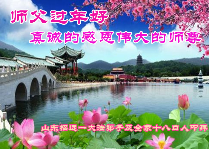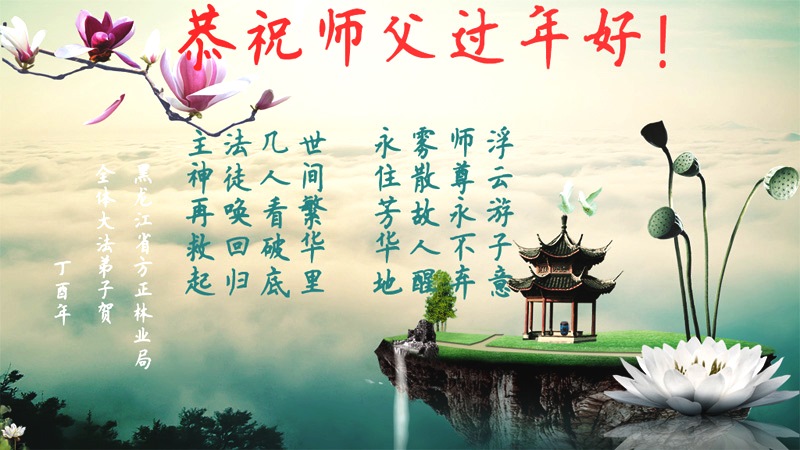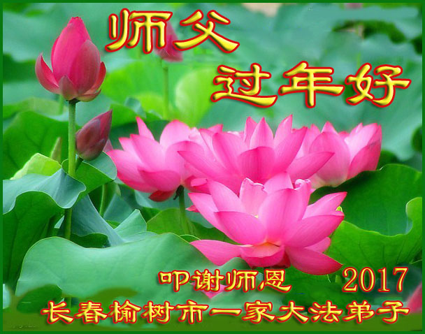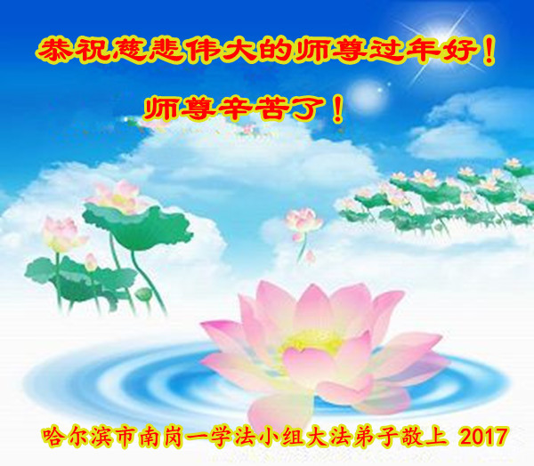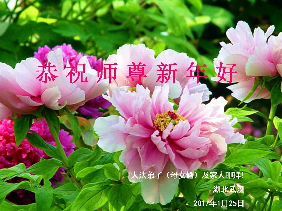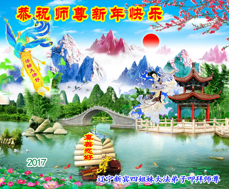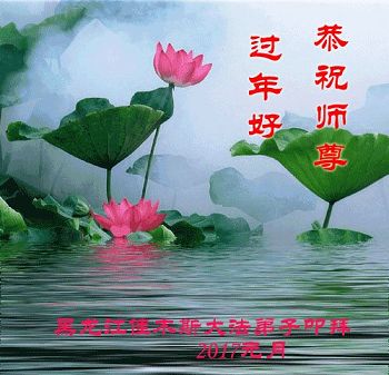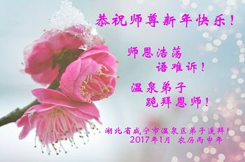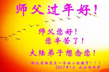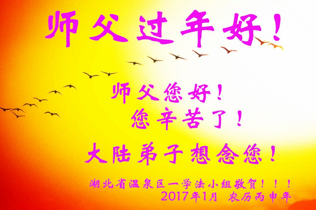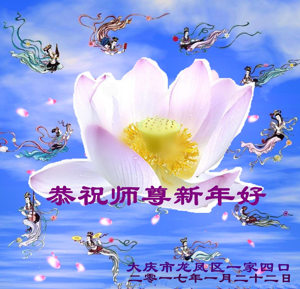 值此丁酉年新年之际,来自四川遂宁、辽宁抚顺、吉林长春、山东省威海、河北石家庄、吉林德惠、四川成都、山东招远、辽宁鞍山、湖北武汉、吉林舒兰、辽宁义县、重庆开州、湖北天门、胜利油田等七省十五地的资料点的大法弟子给慈悲伟大的李洪志师尊拜年!