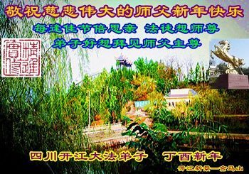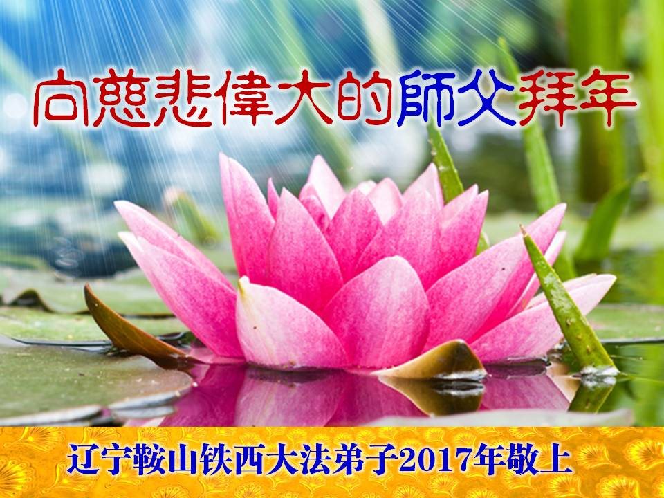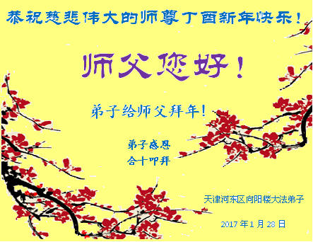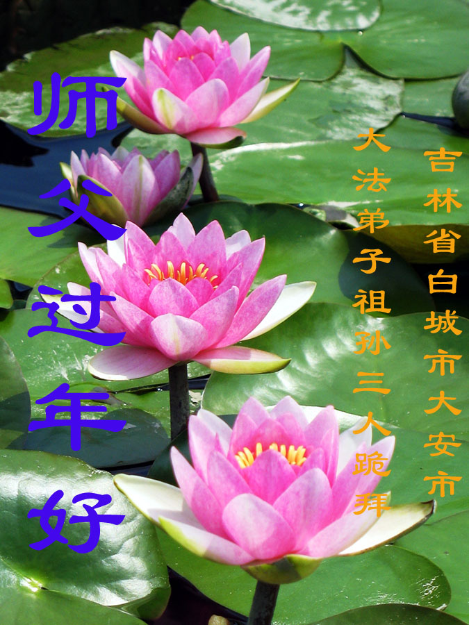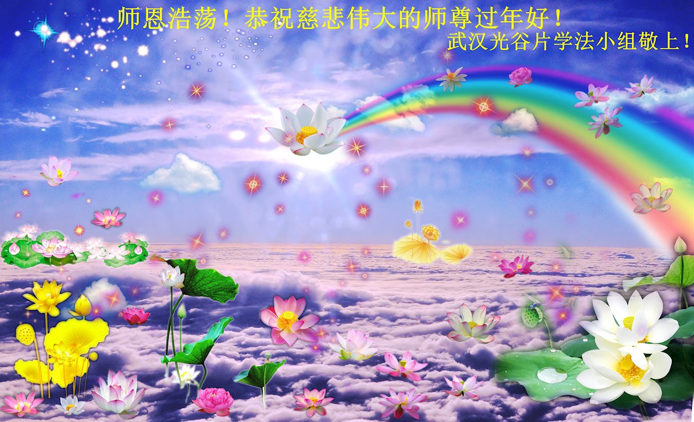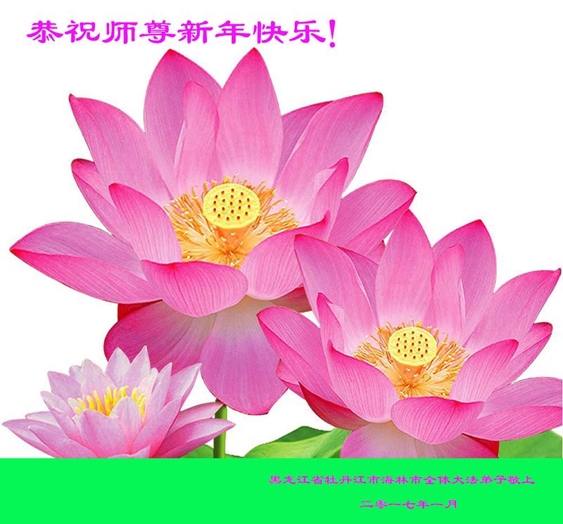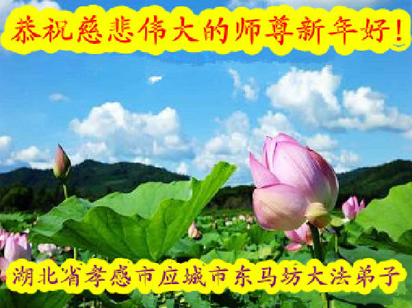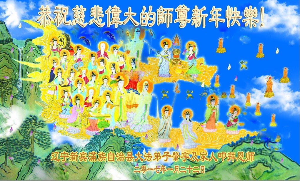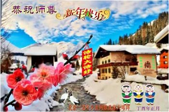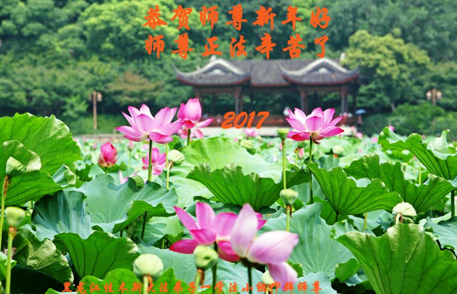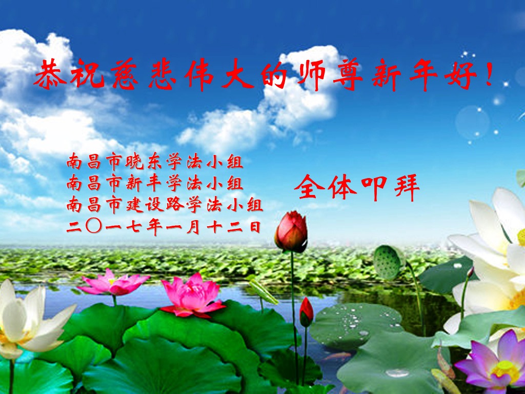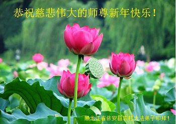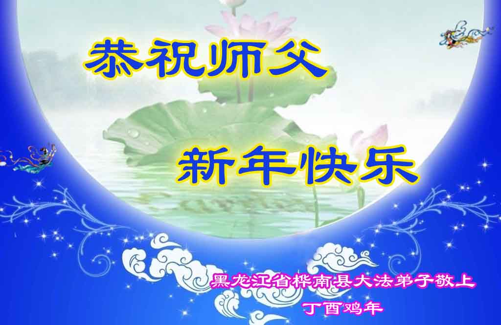 值此丁酉年新年之际,来自四川遂宁、辽宁抚顺、吉林长春、山东省威海、河北石家庄、吉林德惠、四川成都、山东招远、辽宁鞍山、湖北武汉、吉林舒兰、辽宁义县、重庆开州、湖北天门、胜利油田等七省十五地的资料点的大法弟子给慈悲伟大的李洪志师尊拜年!