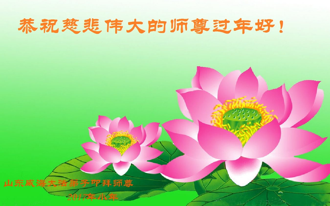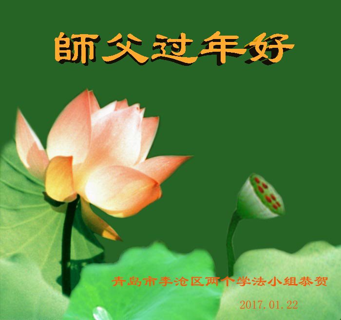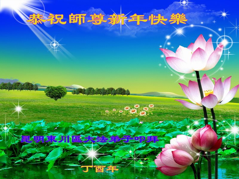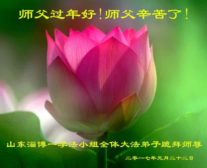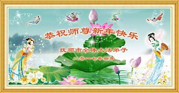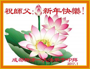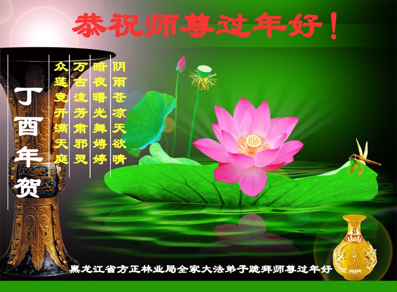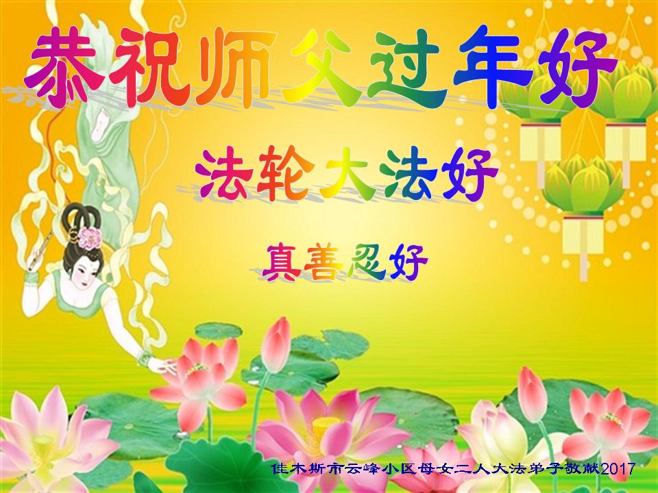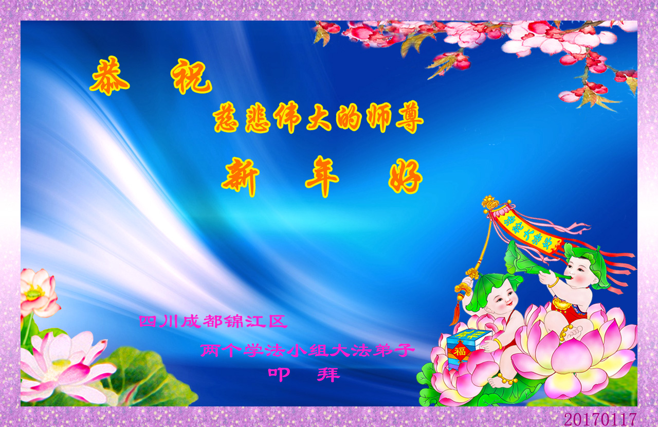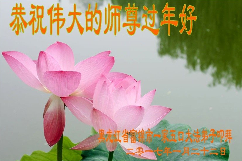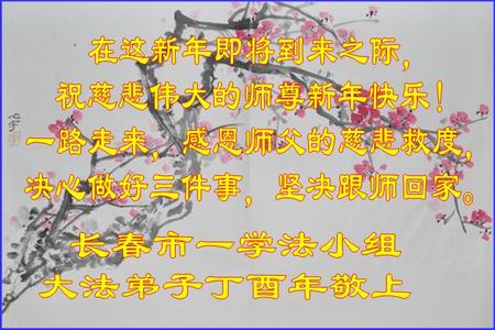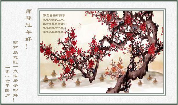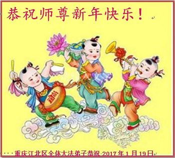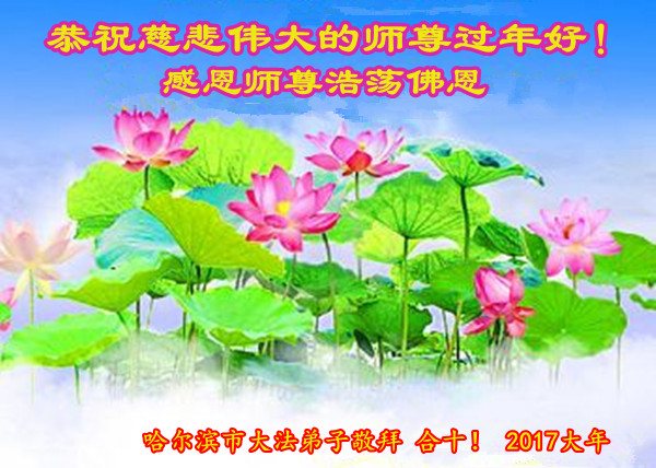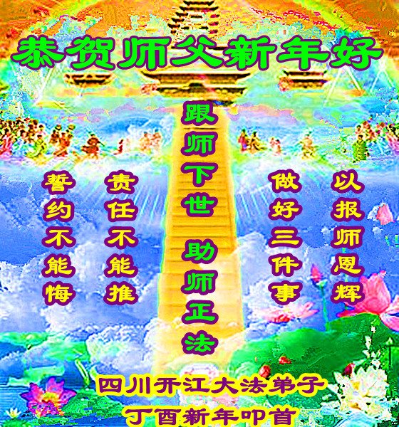 值此丁酉年新年之际,来自四川遂宁、辽宁抚顺、吉林长春、山东省威海、河北石家庄、吉林德惠、四川成都、山东招远、辽宁鞍山、湖北武汉、吉林舒兰、辽宁义县、重庆开州、湖北天门、胜利油田等七省十五地的资料点的大法弟子给慈悲伟大的李洪志师尊拜年!