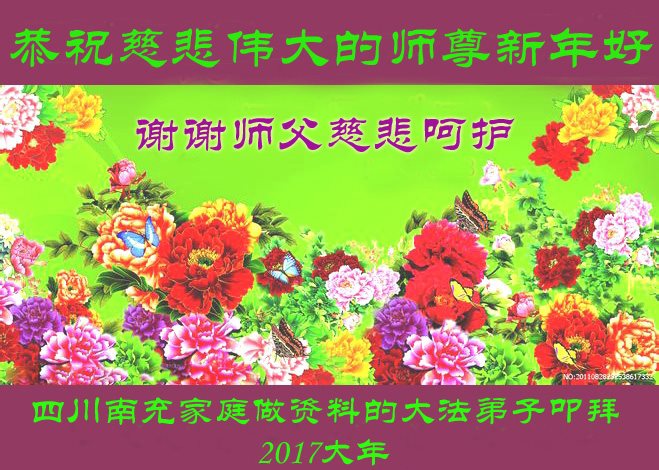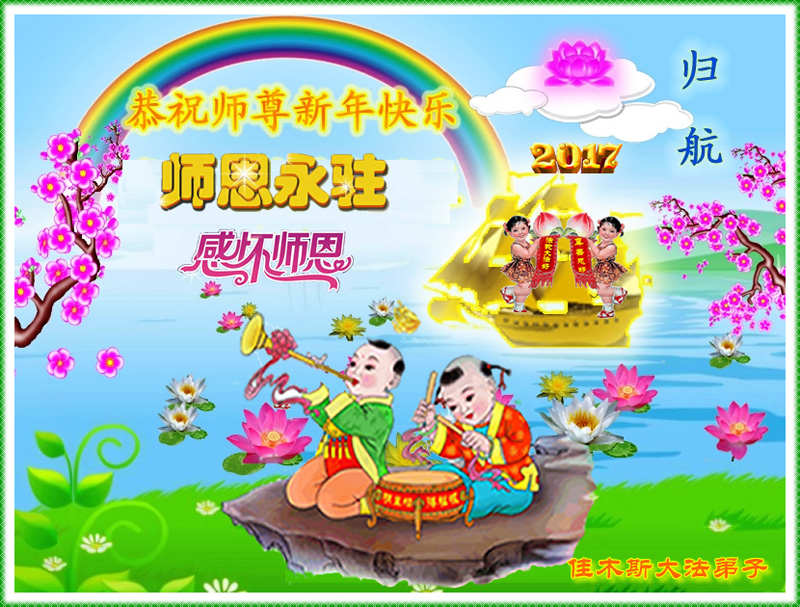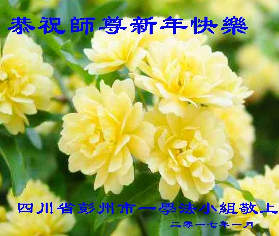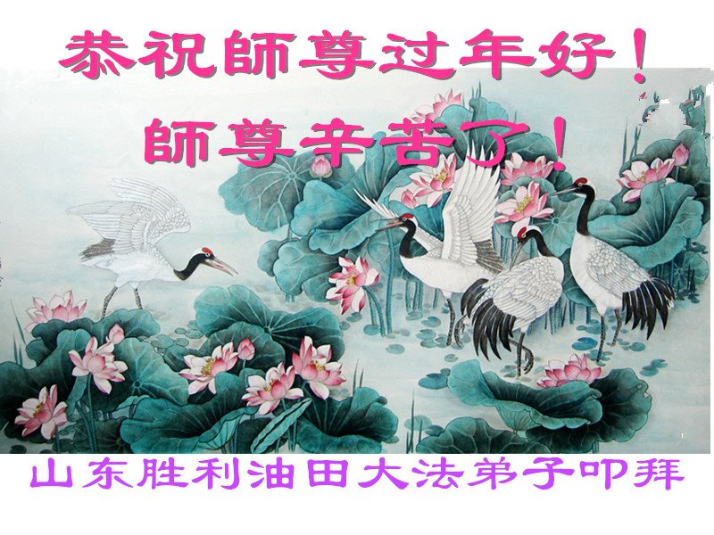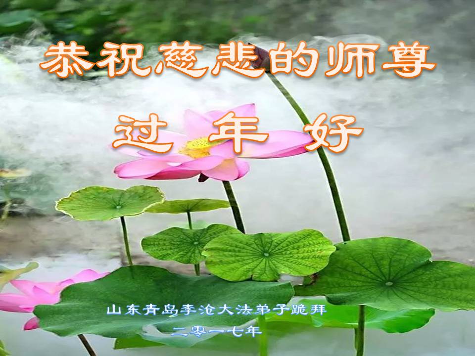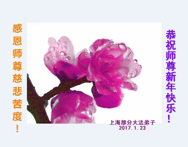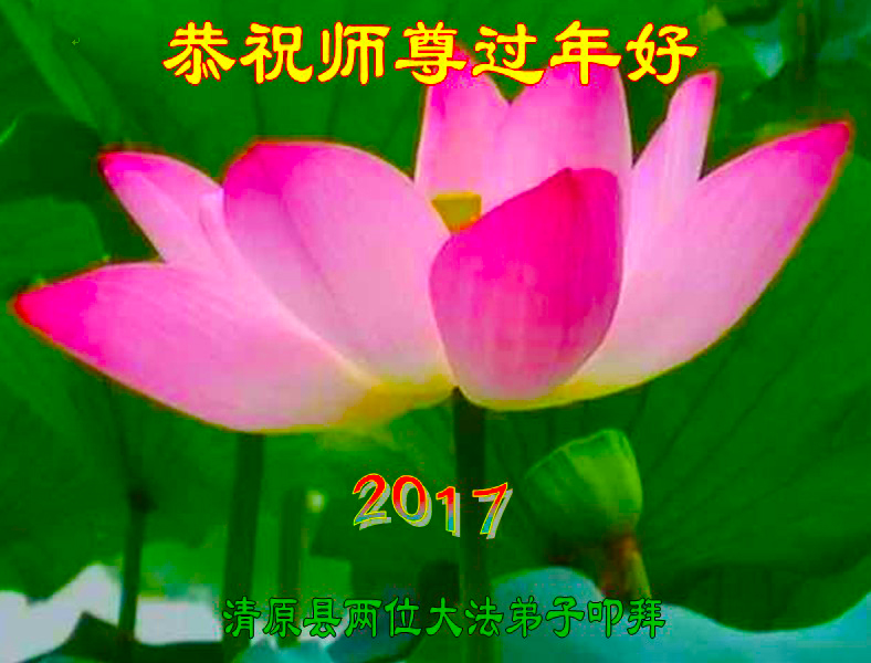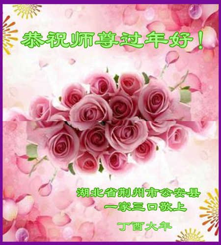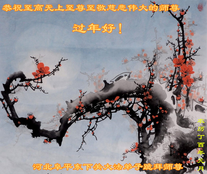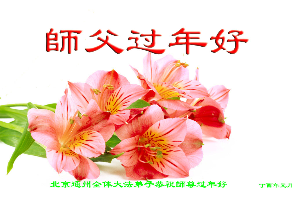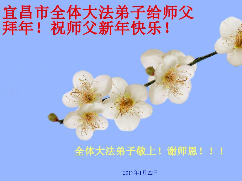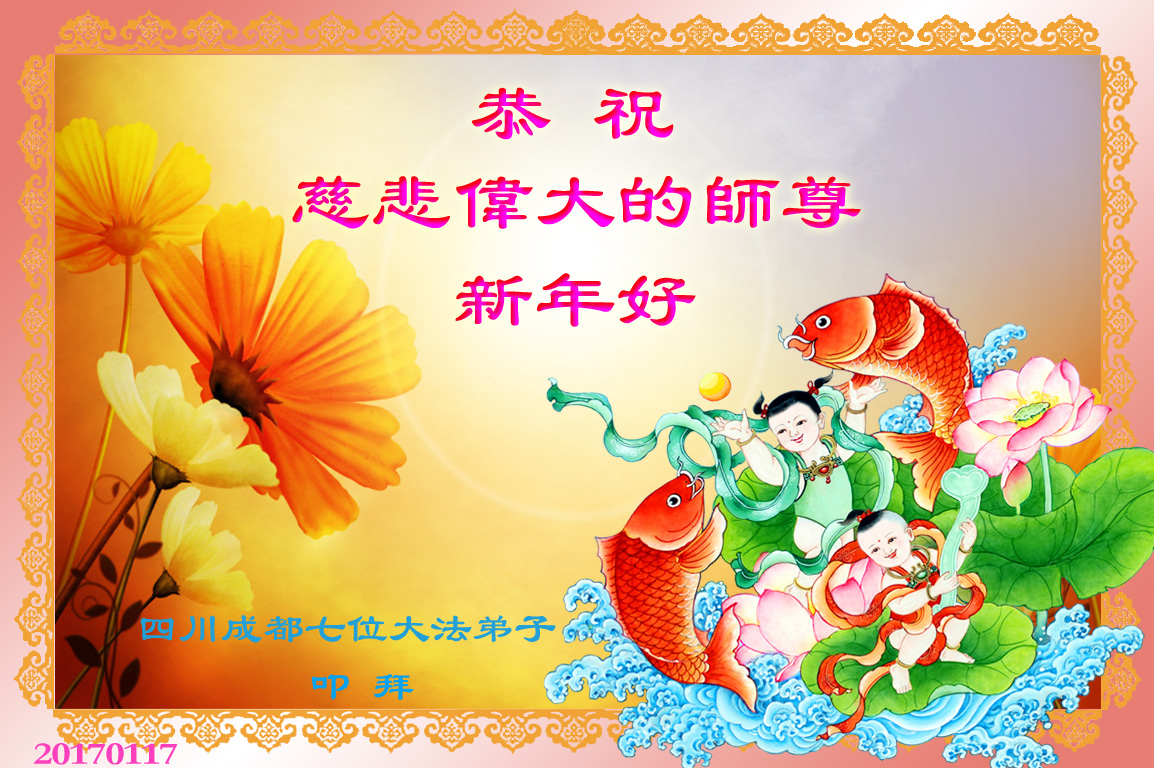 值此丁酉年新年之际,来自四川遂宁、辽宁抚顺、吉林长春、山东省威海、河北石家庄、吉林德惠、四川成都、山东招远、辽宁鞍山、湖北武汉、吉林舒兰、辽宁义县、重庆开州、湖北天门、胜利油田等七省十五地的资料点的大法弟子给慈悲伟大的李洪志师尊拜年!