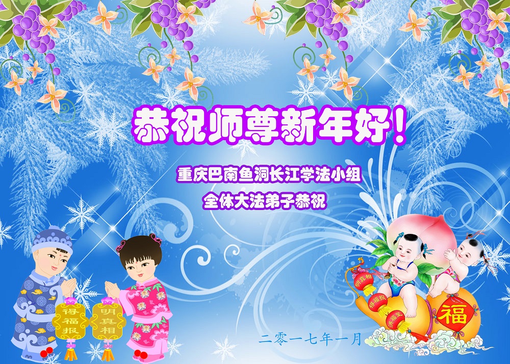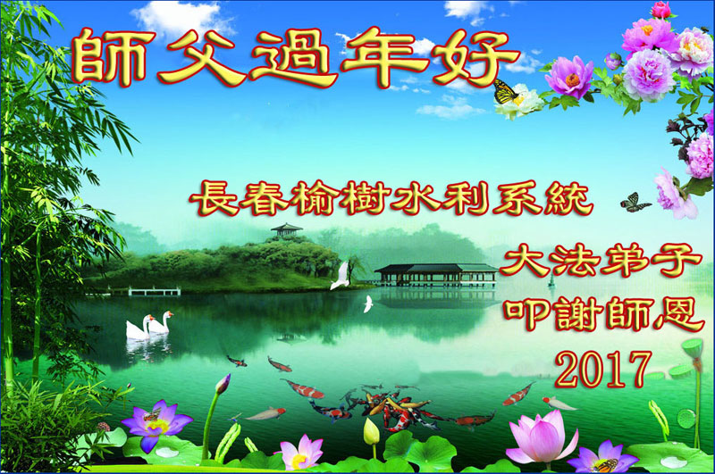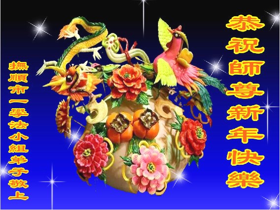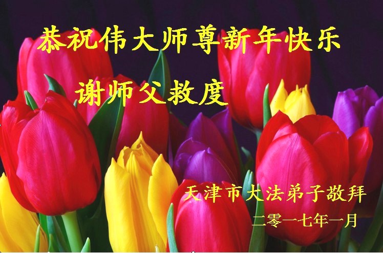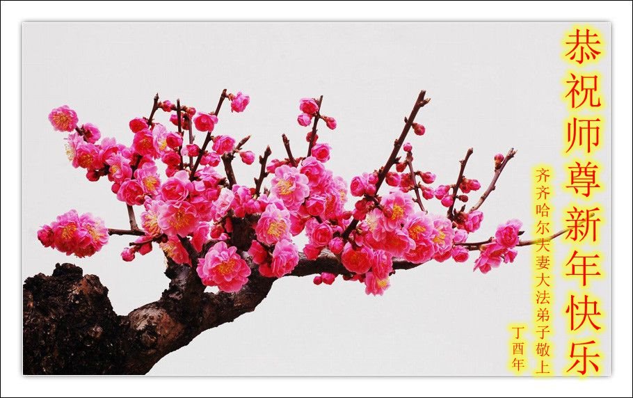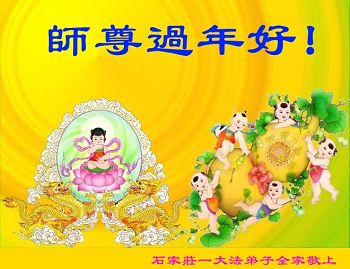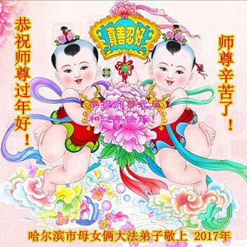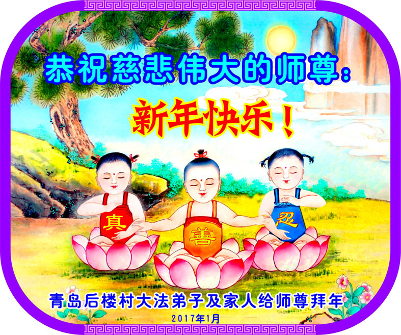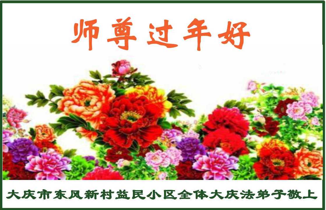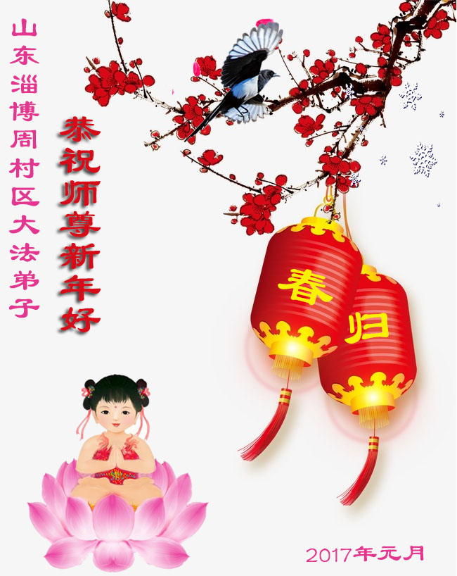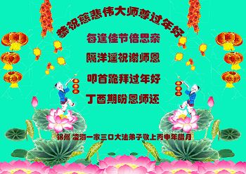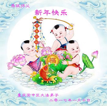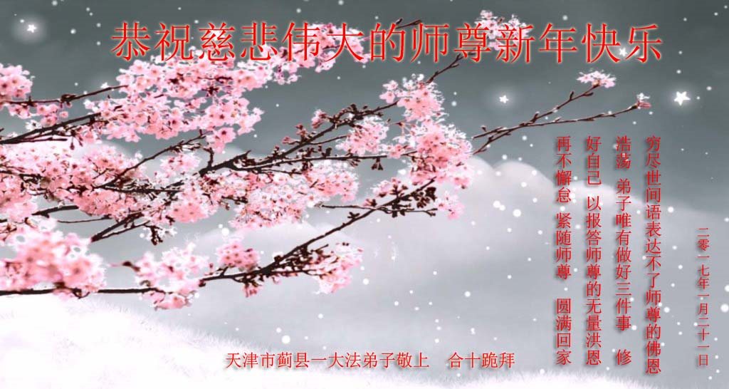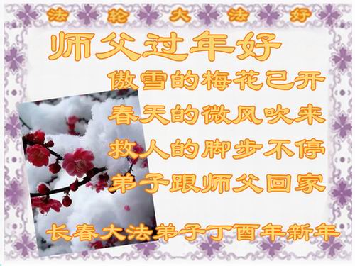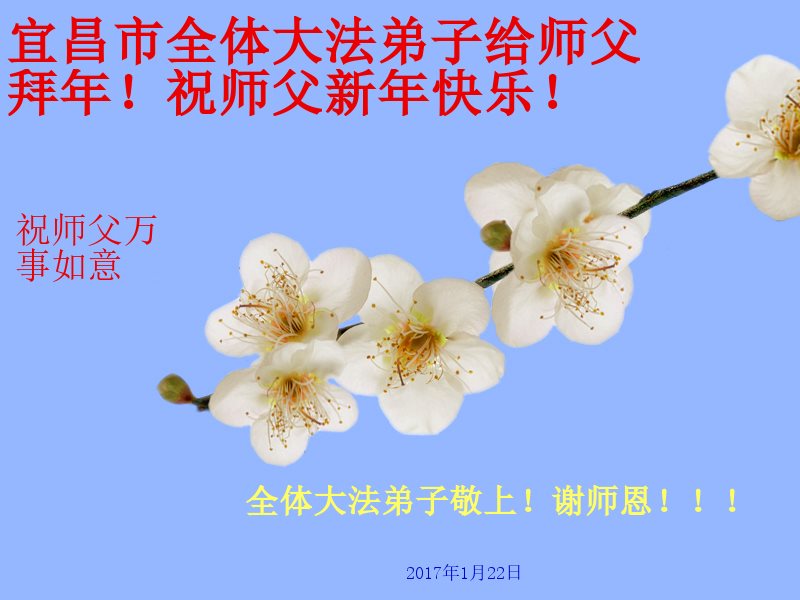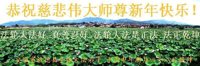 值此丁酉年新年之际,来自四川遂宁、辽宁抚顺、吉林长春、山东省威海、河北石家庄、吉林德惠、四川成都、山东招远、辽宁鞍山、湖北武汉、吉林舒兰、辽宁义县、重庆开州、湖北天门、胜利油田等七省十五地的资料点的大法弟子给慈悲伟大的李洪志师尊拜年!