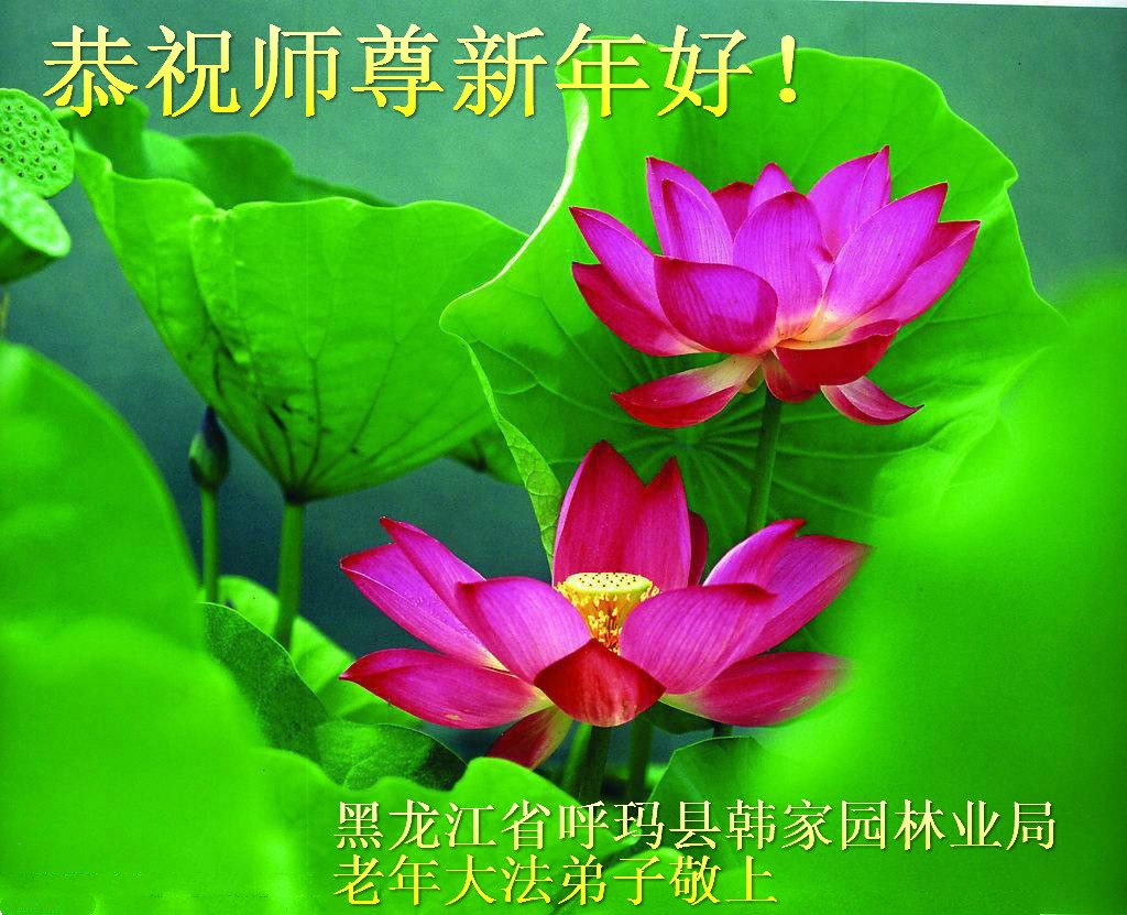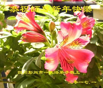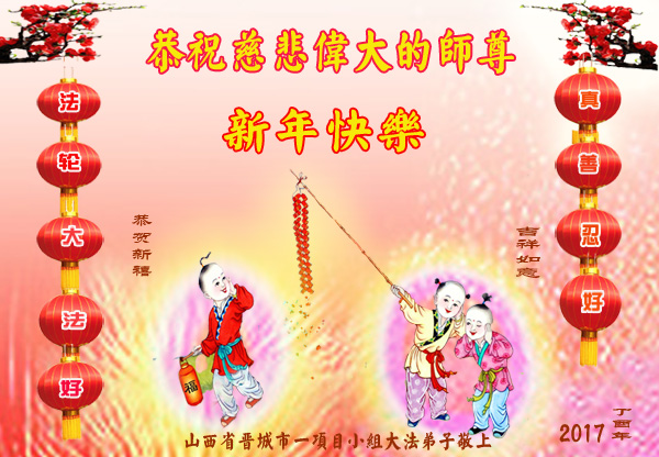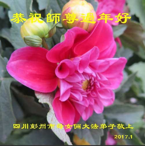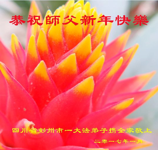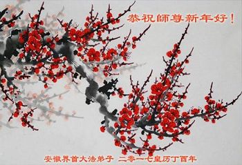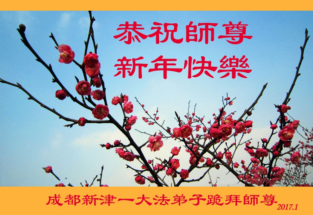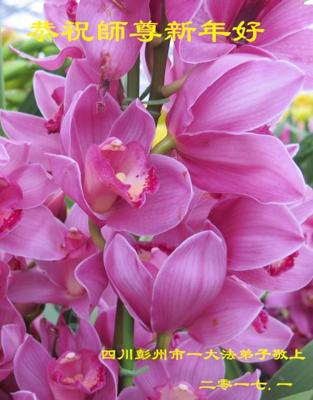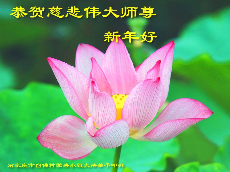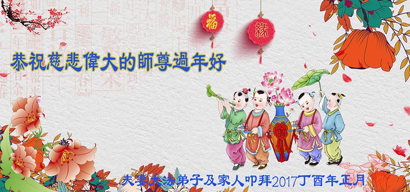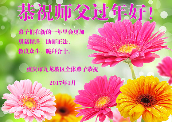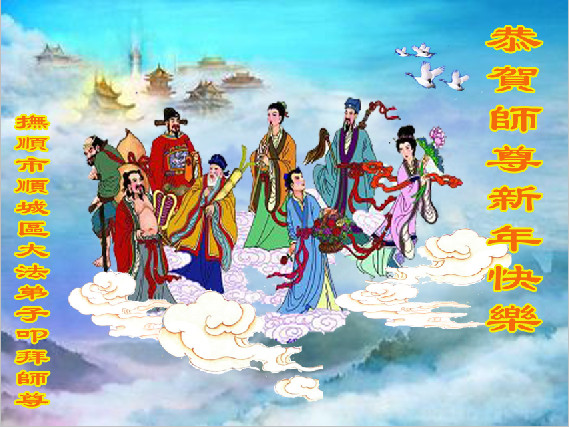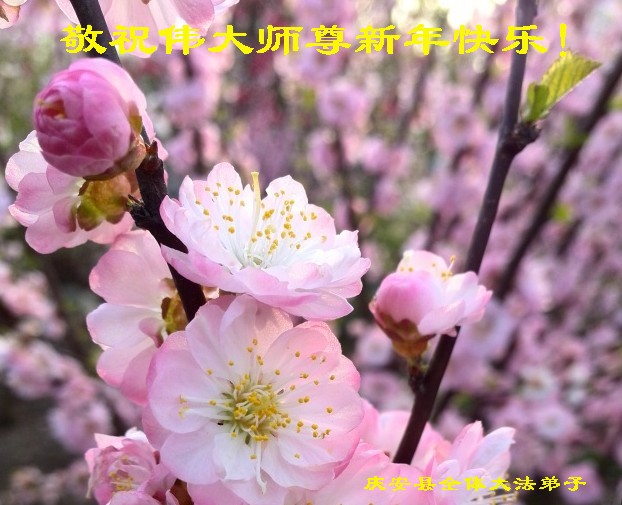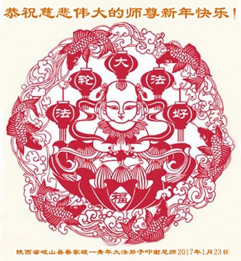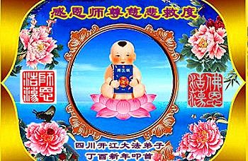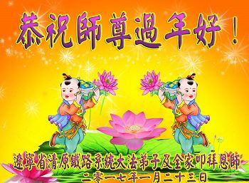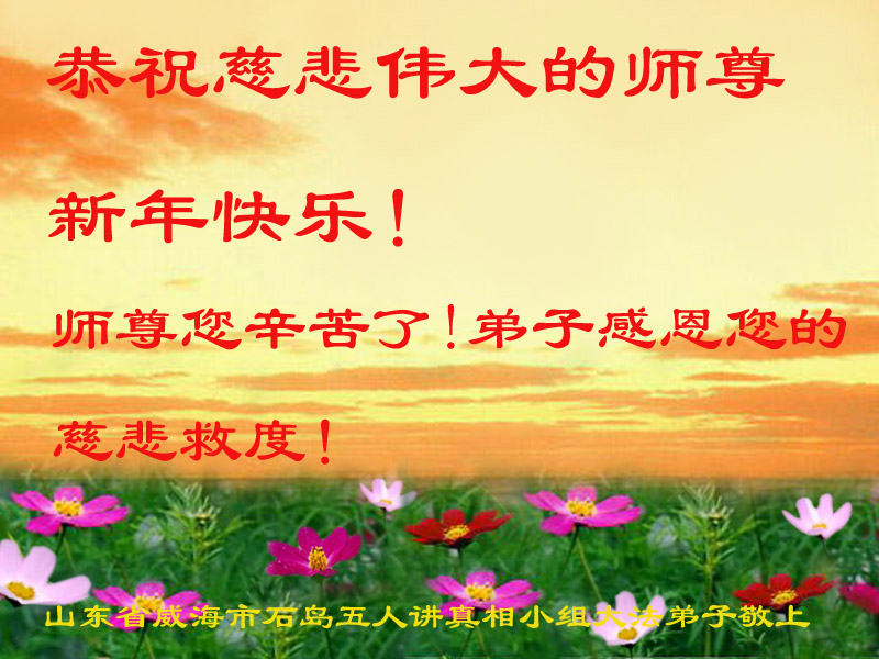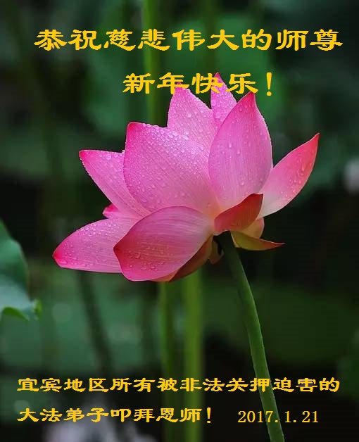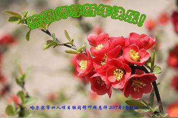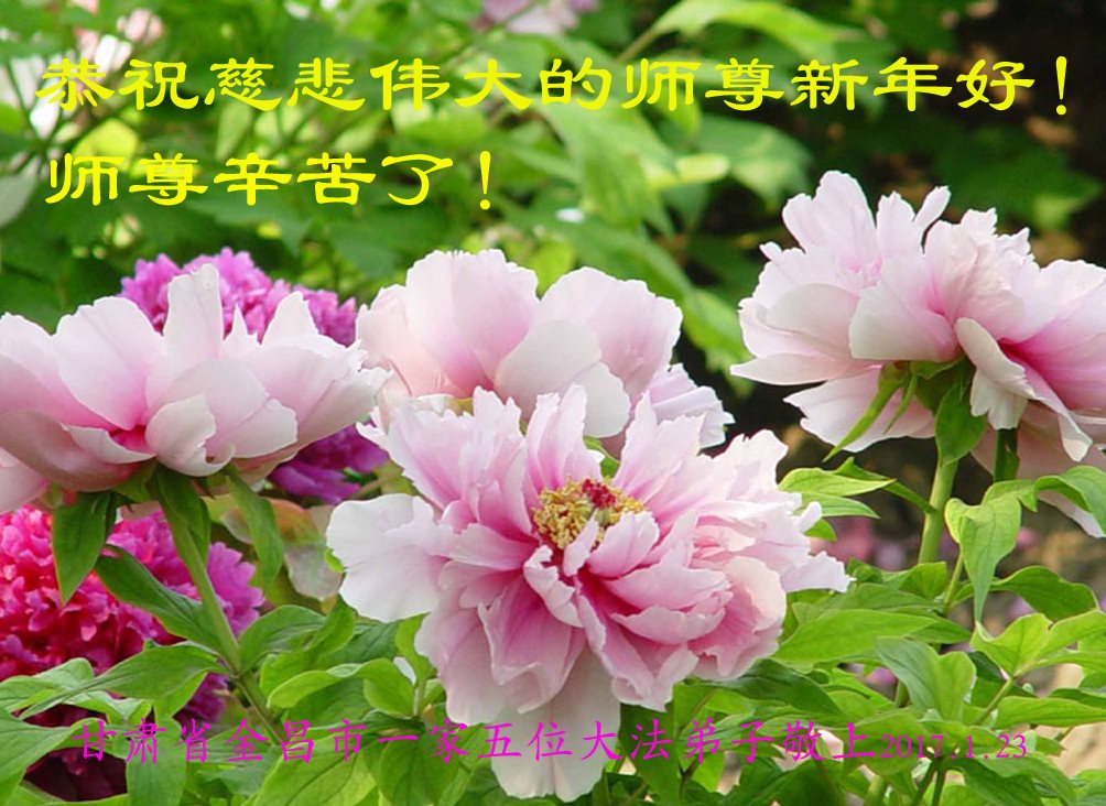 值此丁酉年新年之际,来自四川遂宁、辽宁抚顺、吉林长春、山东省威海、河北石家庄、吉林德惠、四川成都、山东招远、辽宁鞍山、湖北武汉、吉林舒兰、辽宁义县、重庆开州、湖北天门、胜利油田等七省十五地的资料点的大法弟子给慈悲伟大的李洪志师尊拜年!