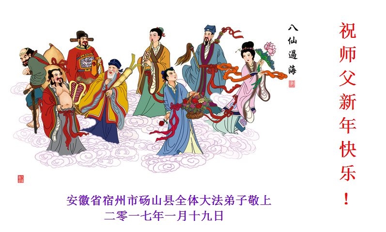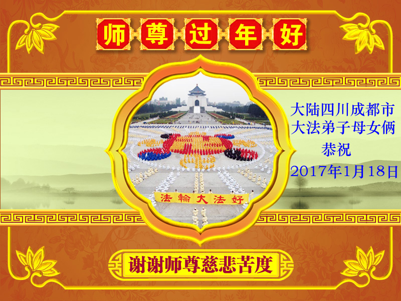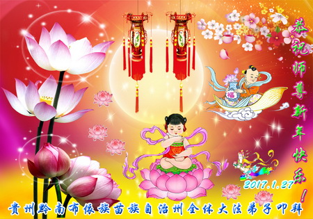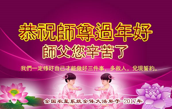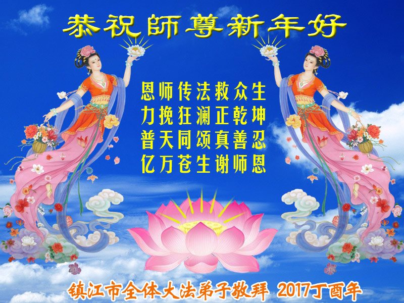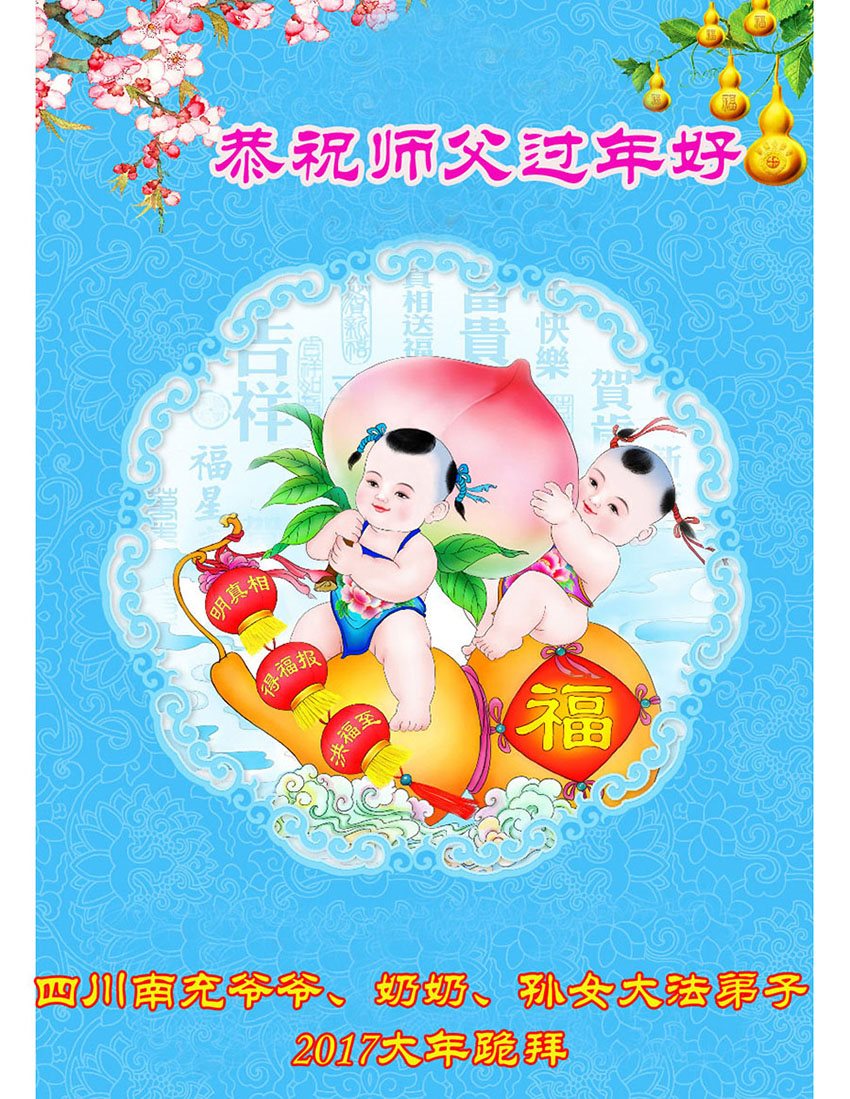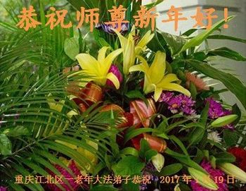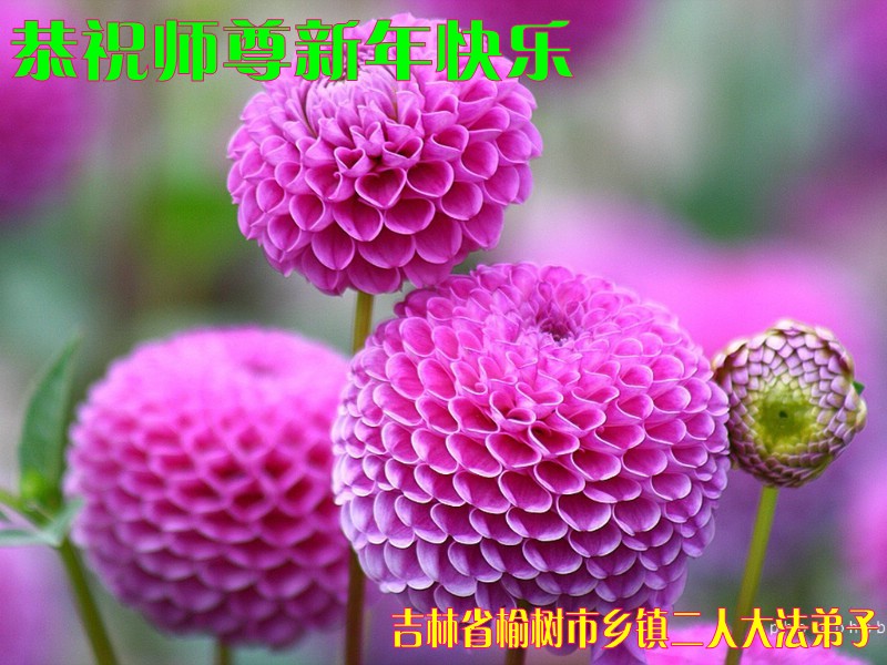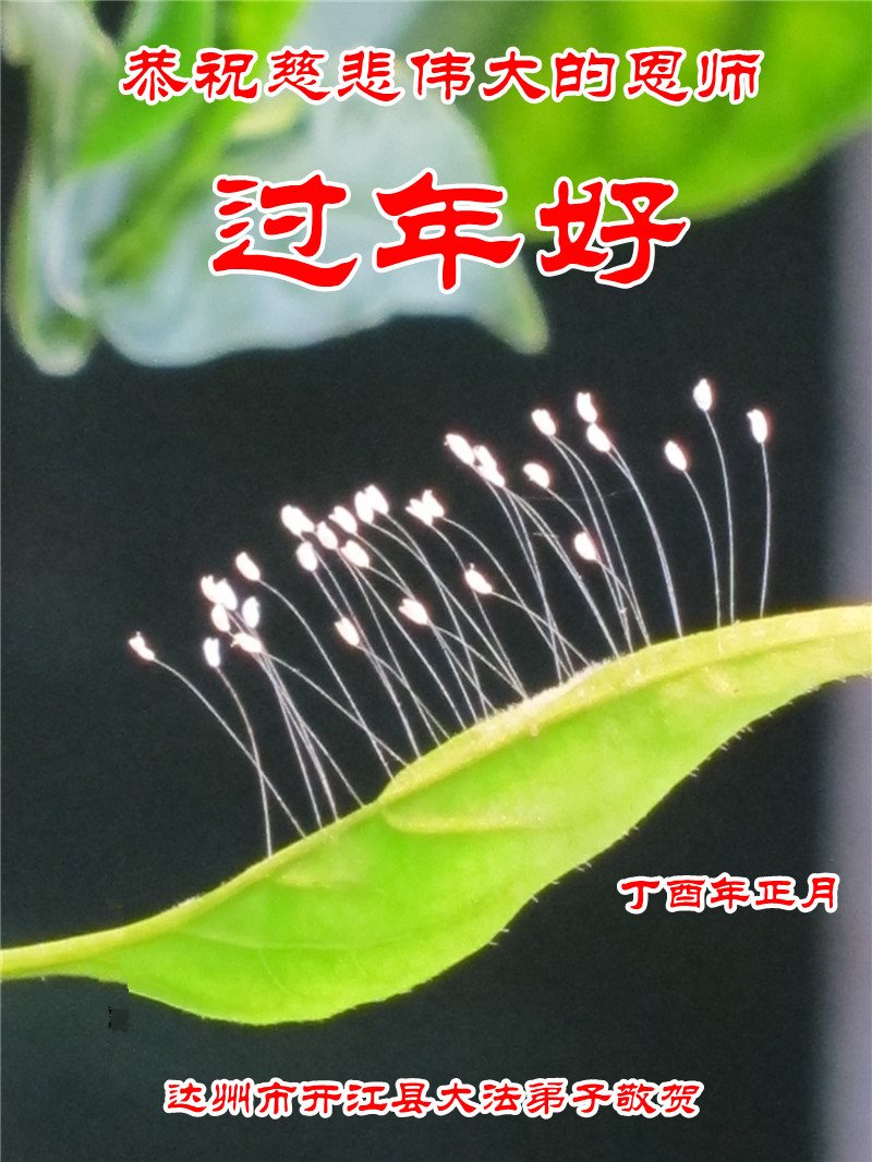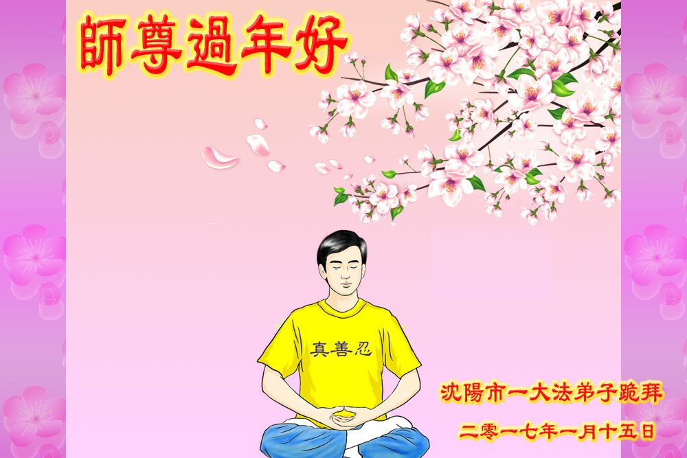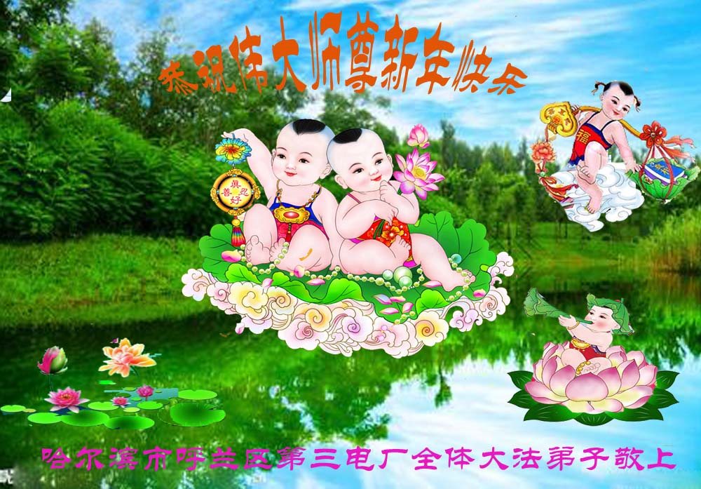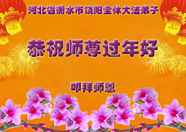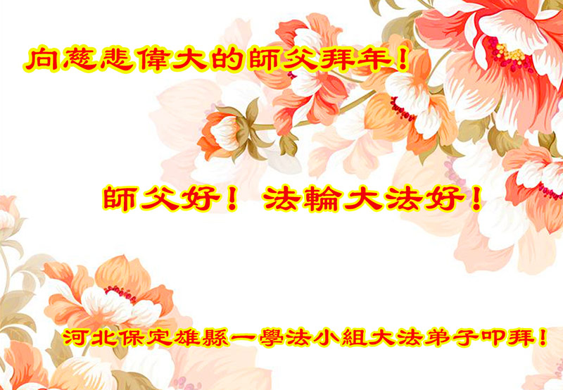 值此丁酉年新年之际,来自四川遂宁、辽宁抚顺、吉林长春、山东省威海、河北石家庄、吉林德惠、四川成都、山东招远、辽宁鞍山、湖北武汉、吉林舒兰、辽宁义县、重庆开州、湖北天门、胜利油田等七省十五地的资料点的大法弟子给慈悲伟大的李洪志师尊拜年!