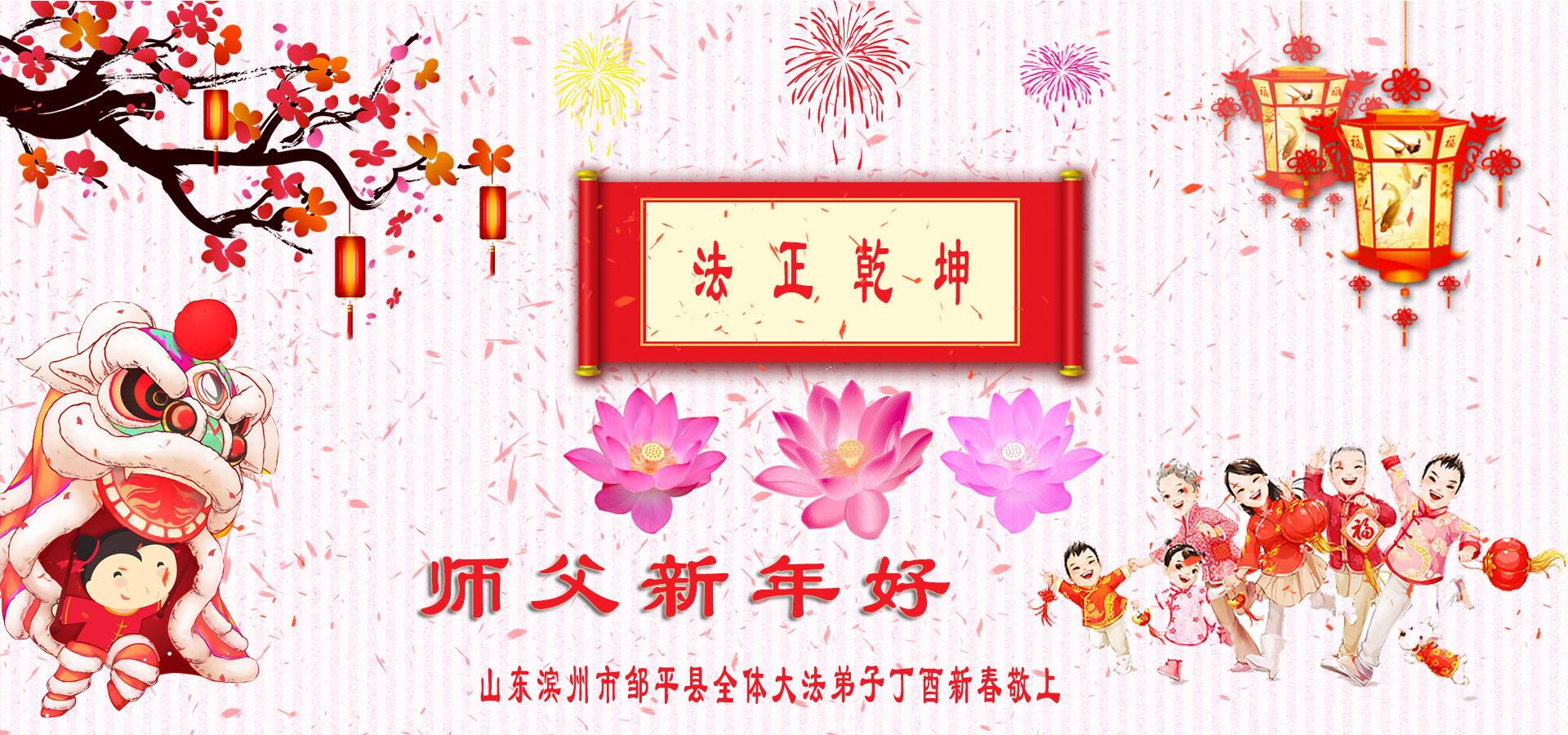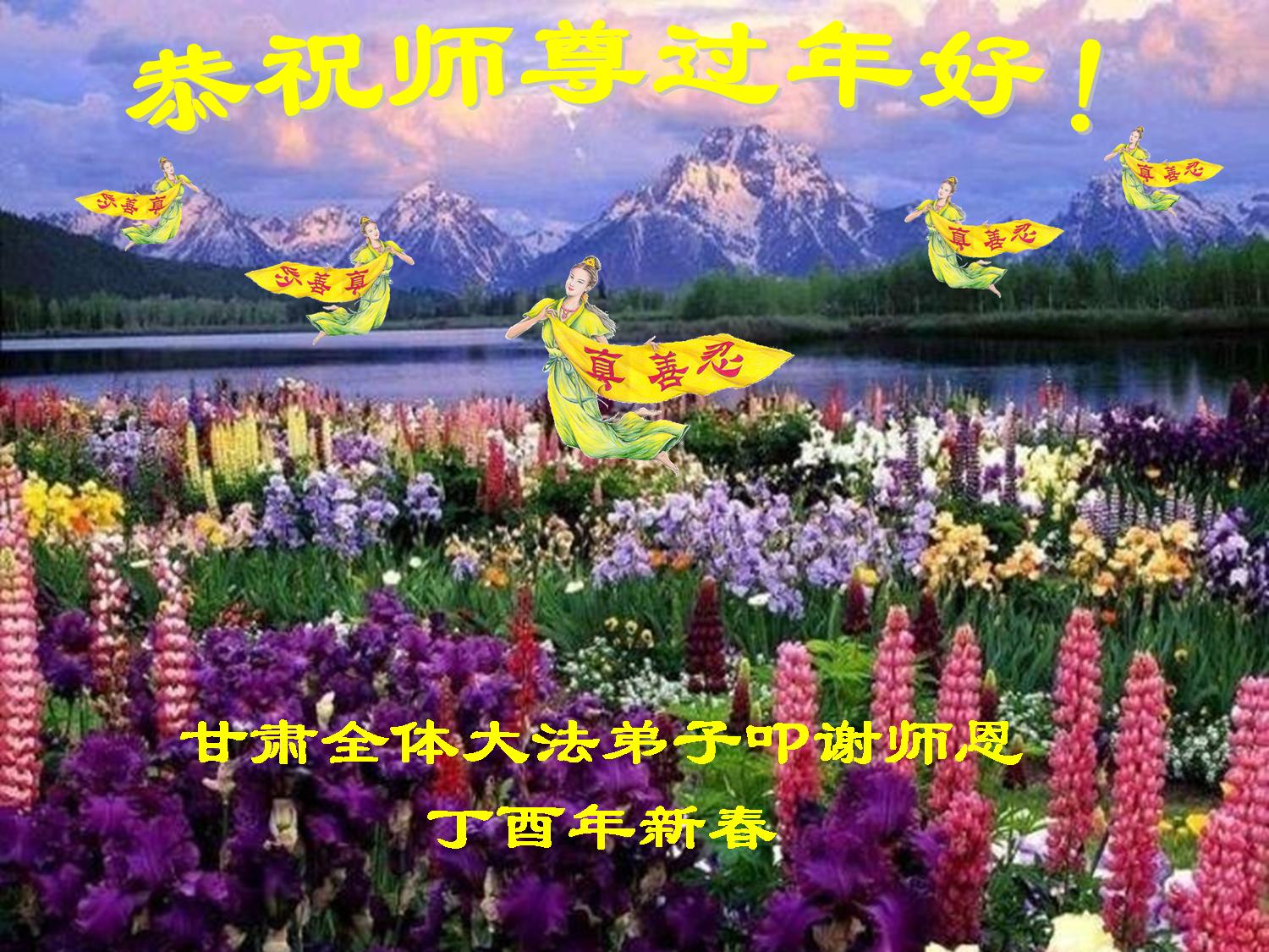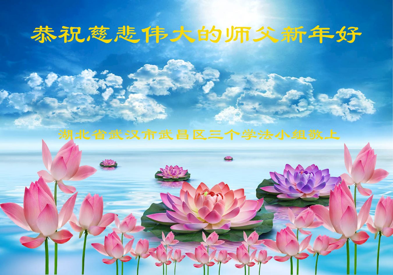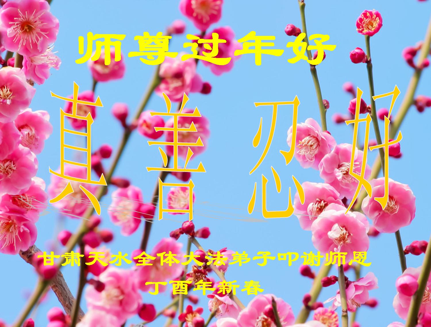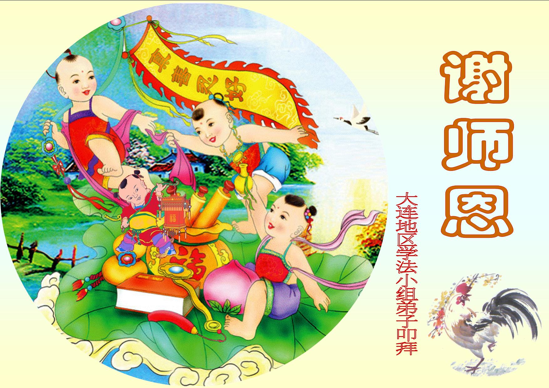 值此丁酉年新年之际,来自四川遂宁、辽宁抚顺、吉林长春、山东省威海、河北石家庄、吉林德惠、四川成都、山东招远、辽宁鞍山、湖北武汉、吉林舒兰、辽宁义县、重庆开州、湖北天门、胜利油田等七省十五地的资料点的大法弟子给慈悲伟大的李洪志师尊拜年!