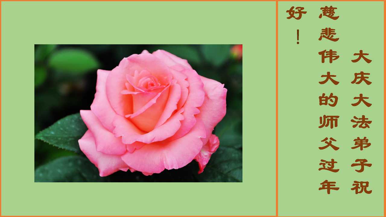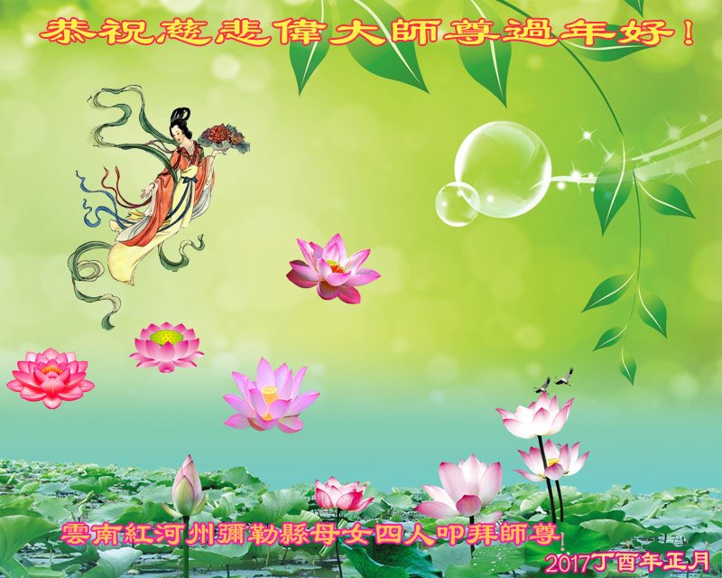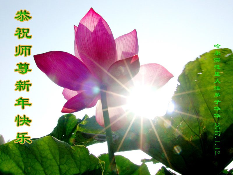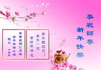 “感谢师父,祝师父新年快乐。”她说:“感谢师父帮助我成长,指导我让我有一个很明确的方向,在茫茫人海中不迷失自己,每次面对困难考验时总感觉师父就在身边,一直在教导我、帮助我度过难关。我很困难时多学法就没事了。我要更精进,以报师恩。”