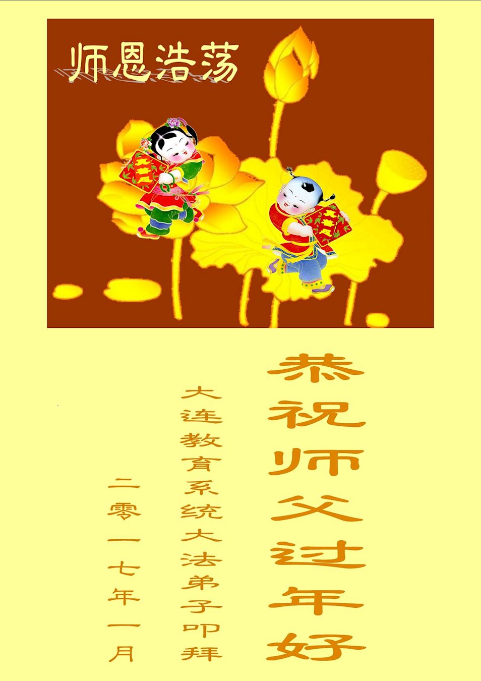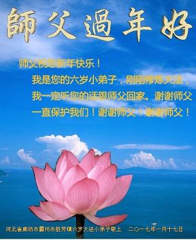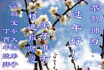师父您好:弟子值此丁酉新年之际给慈悲伟大的师父拜年:师父过年好!您辛苦了!恭祝师父新年快乐!