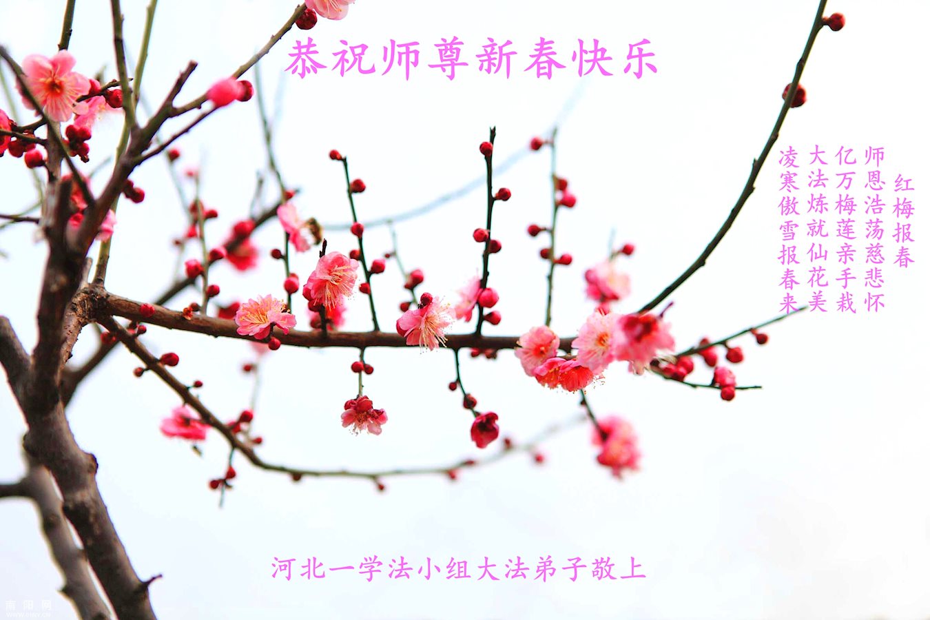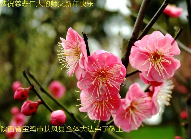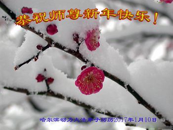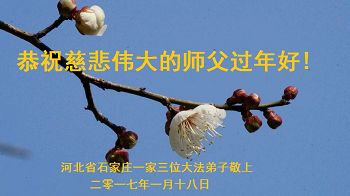 我家也是亿万梅花的一朵小花。十二年来,在师尊的看护下,在同修的帮助下,这朵小花越开越茂盛。不管严寒酷暑,邪恶疯狂。这朵小花依然坚定的站立在风雪中。发放着温馨的花香,唤醒每一个生命的归来。这一切一切都是师尊替弟子和众生承受了无边之苦,才迎来了二零一七年的喜悦新年。