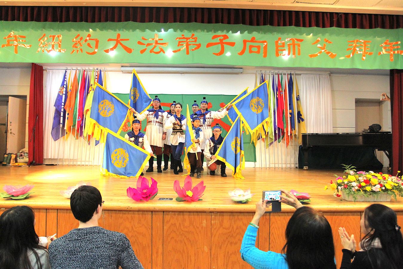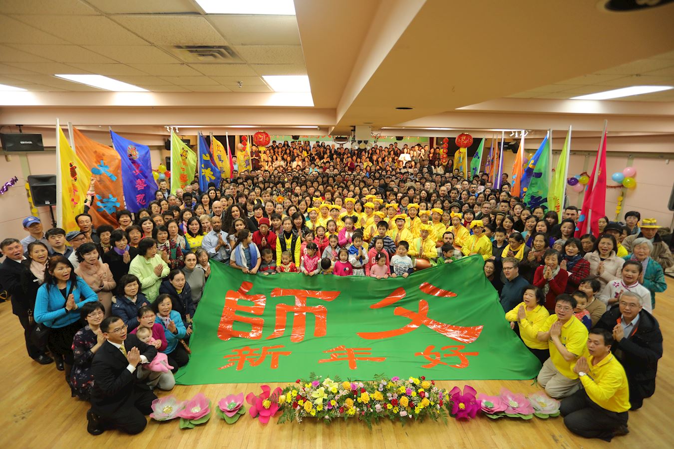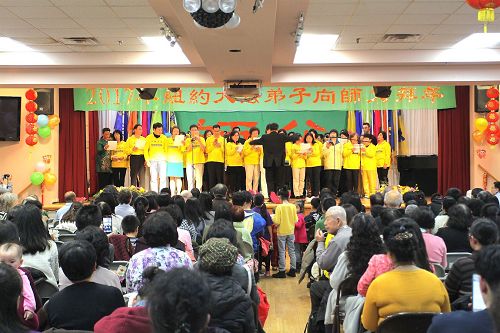 每到新年,纽约法轮功学员都举办活动给师父拜年。当天,在法拉盛的台湾会馆大厅内外挤满了人,有白发苍苍的长者,也有三、四岁稚气未脱的孩童,也有妈妈带着襁褓中的婴儿,白裔、非裔、印度裔等,不同族裔的法轮功学员,从四面八方齐聚一堂。