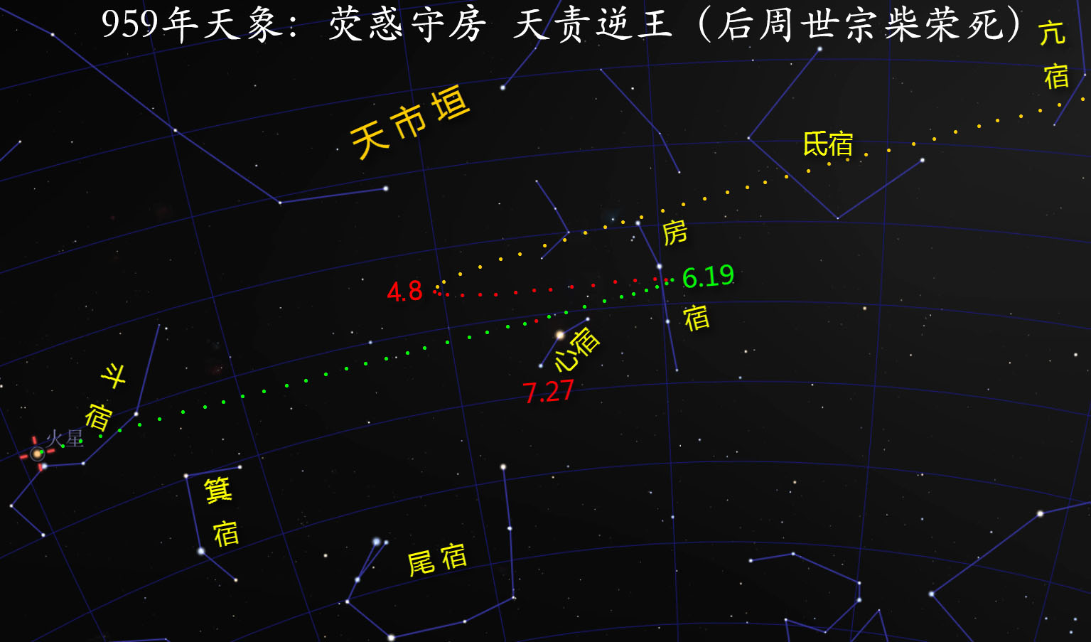 此时正是夏六月,荧惑守房的凶险结束,火星犯入了心宿——代表天子的天区,柴荣病危了。在火星即将离开心宿的时候,7月27日(图中红点的位置),柴荣驾崩。柴荣幼子即位半年,次年正月初三,殿前都点检赵匡胤,就陈桥兵变黄袍加身,取代后周建立宋朝,应了“点检作天子”的谶言。