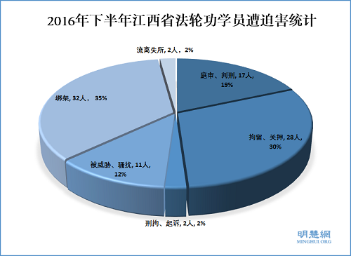 2016年下半年,江西省法轮功学员遭骚扰、非法勒索、非法抓捕、非法关押、非法判刑等各种迫害,共计92人,其中11人被非法判刑。