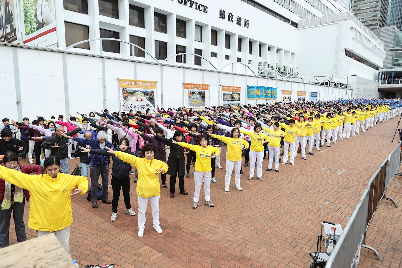 图1:法轮功学员于二零一七年一月一日上午,在香港中环爱丁堡广场集会,恭祝李洪志大师新年好。