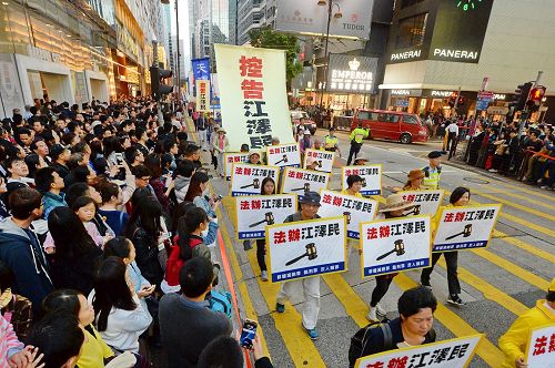 旺角亚皆老街路口,一对操上海口音,年约六、七十岁的夫妇,兴致勃勃地观看游行。太太用相机拍下游行场面。官员模样的丈夫表示,他很赞同法轮功学员的诉求,要法办迫害法轮功的元凶。他说:”法轮功是炼身体的,又不是坏事”,他赞扬游行讲出老百姓心里话:“这是民声。”他说:“游行打出来的抓江泽民,就抓江泽民。该抓的就抓,这些(迫害元凶)都是败类。老百姓都在骂江泽民,骂这些坏人,曾庆红也应该抓,他是一个大贪官。”他称赞习近平抓这些迫害元凶,是为老百姓出气。