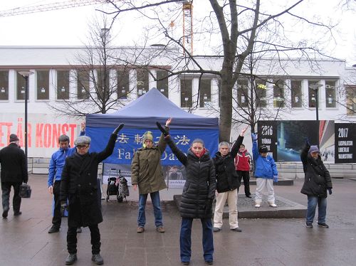 法轮功学员在芬兰首都市中心讲真相,吸引路人的驻足观看。整个活动期间,一波波的民众停下来签名支持法轮功学员反迫害。
