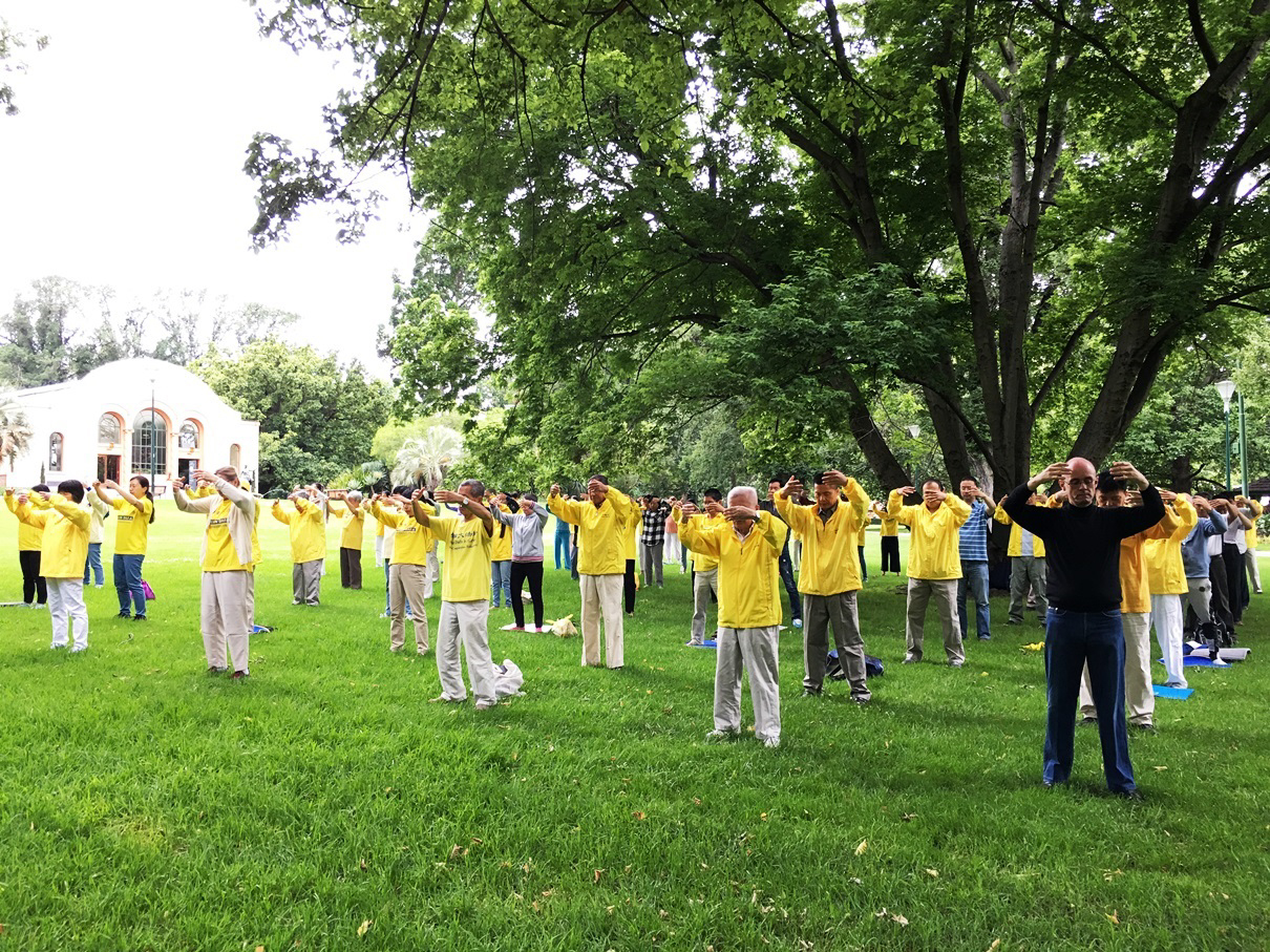 ![]() 二零一七年元旦,部分墨尔本法轮功学员在市中心著名景点集体炼功。 |