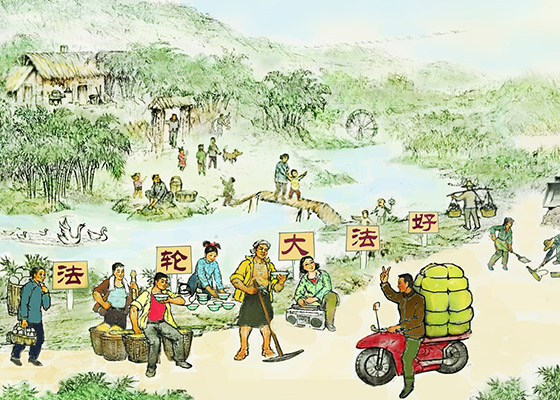 画作根据明慧网二零一五年五月二十日文章《村民都晓得“法轮大法好”》绘制。