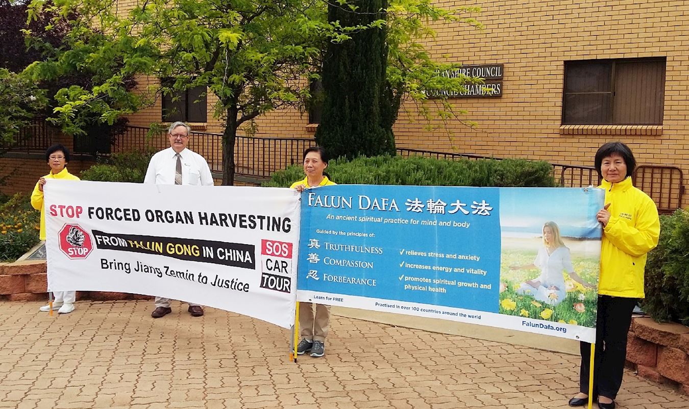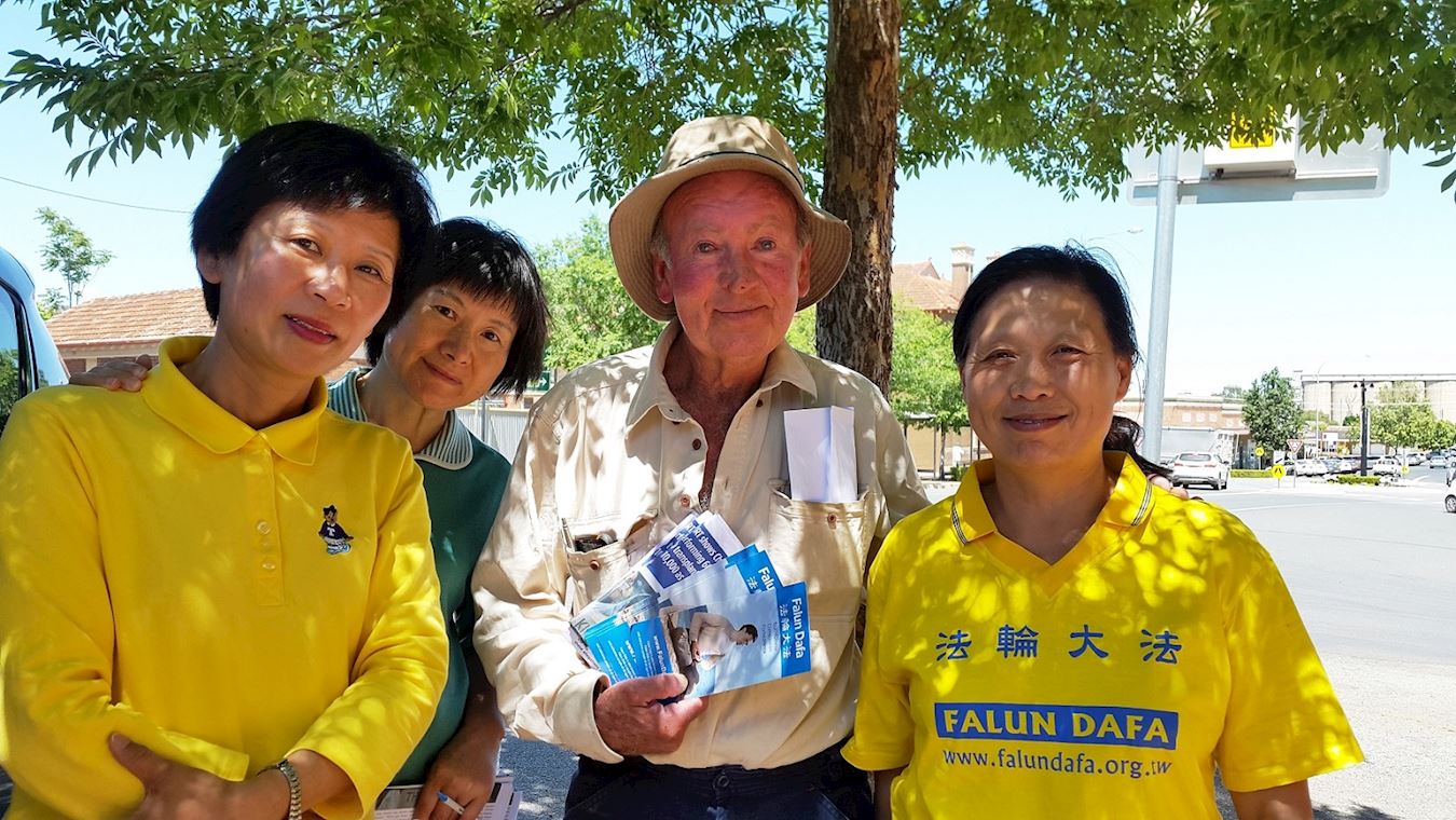 在新南威尔士州Temora地区长老格雷厄姆(Graham)在街上遇见“汽车之旅”学员,他了解真相后赶紧带他们去见当地市长,并把自己在周边地区做议员工作的侄子介绍给他们。格雷厄姆先生表示:你们这样无私的人,在做这么一件对人类非常有意义的事,你们让世界各地的人们知道在中国发生了什么,我希望你们得到十倍以上的更多更好的反馈和成功。每个人都有责任去反对那些他们相信是错误的事。我希望我们政府更应对澳中贸易设限,让中共感到压力和被制约,尽快停止迫害。