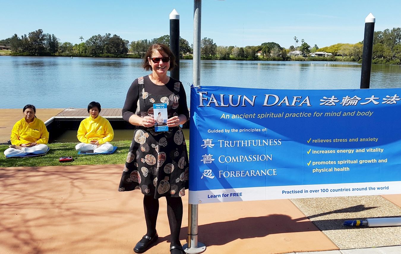 “汽车之旅”成员在新南威尔士州的Taree镇市议会前炼功时,珍妮·罗伯特(Janine Roberts)主动向法轮功学员用中文说:你好!
