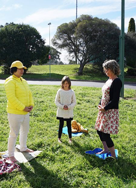 她告诉法轮功学员,她已经了解了法轮功真相,她表示:“在水边看到一群美丽祥和的人们在炼法轮功,我就想过来说:你好!这场迫害不应该发生,你们所做的事能逐步把遗失的中国传统文化传给现代社会。我在当地教中文,我的中国学生都不知道或者不接受天安门‘六四’大屠杀的真相。因为他们被中共洗脑了。我们国家的人们能从电视和媒体中看到中共迫害法轮功等群体的真相。希望澳洲政府敦促中共停止迫害,并如欧美那般制定法律去帮助制止迫害和活摘器官。