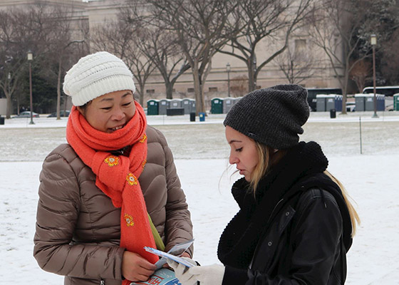 美国首都华盛顿降下今年入冬以来的第一场雪,气温也降至零摄氏度以下,几位东、西方法轮功学员仍然冒着严寒在美国国家广场炼功,向过往的游人传递真相。