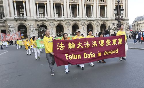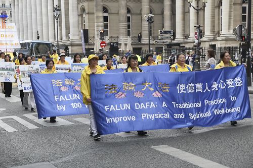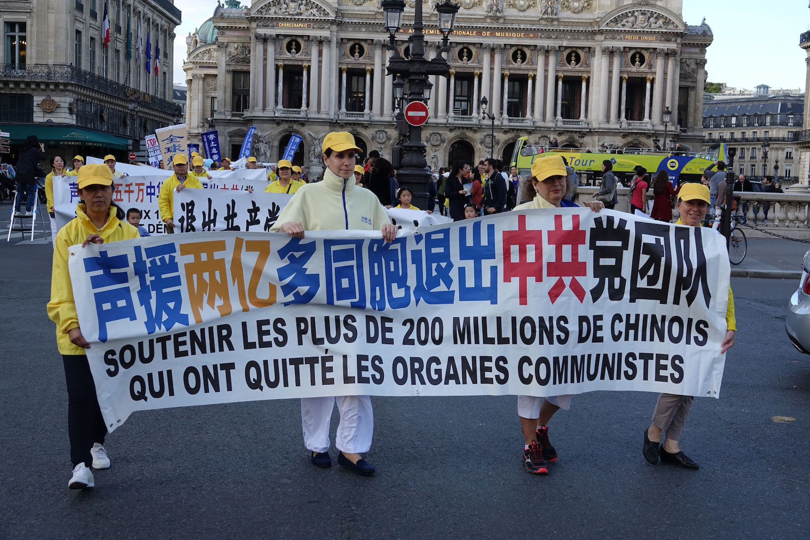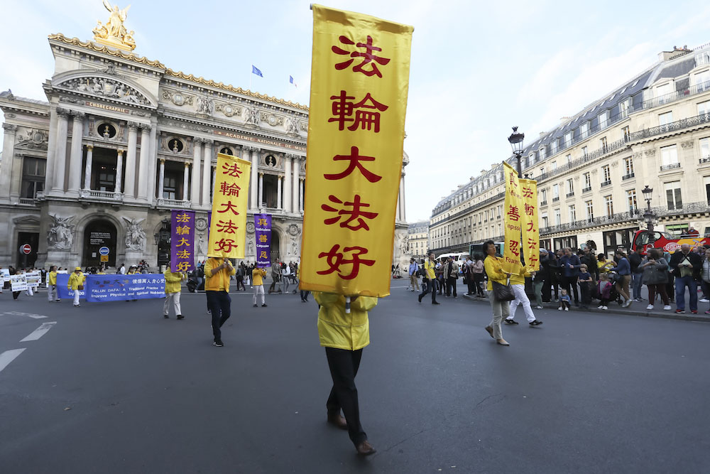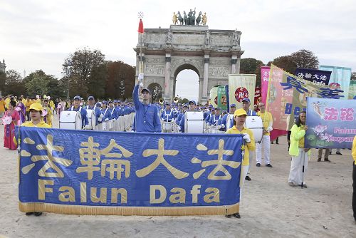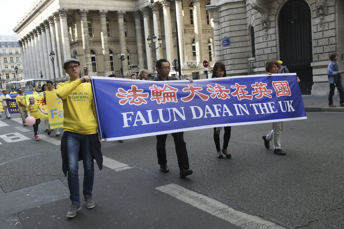 【明慧网二零一七年十月一日】(明慧记者德祥、德龙法国巴黎报道)二零一七年九月三十日下午五点,来自欧洲三十一个国家一千三百余名法轮功学员聚集在法国首都巴黎市中心 Place de la Bourse广场,拉开了大游行的序幕,游行队伍中包括《天国乐团》、腰鼓队、舞龙队、仙女队和功法表演,展现了法轮大法的美好。同时游行呼吁人们共同制止中共对法轮功长达十八年的迫害,包括手持被中共迫害致死的法轮功学员照片的队伍、揭露中共活体摘取法轮功学员器官的方阵以及退出中共。