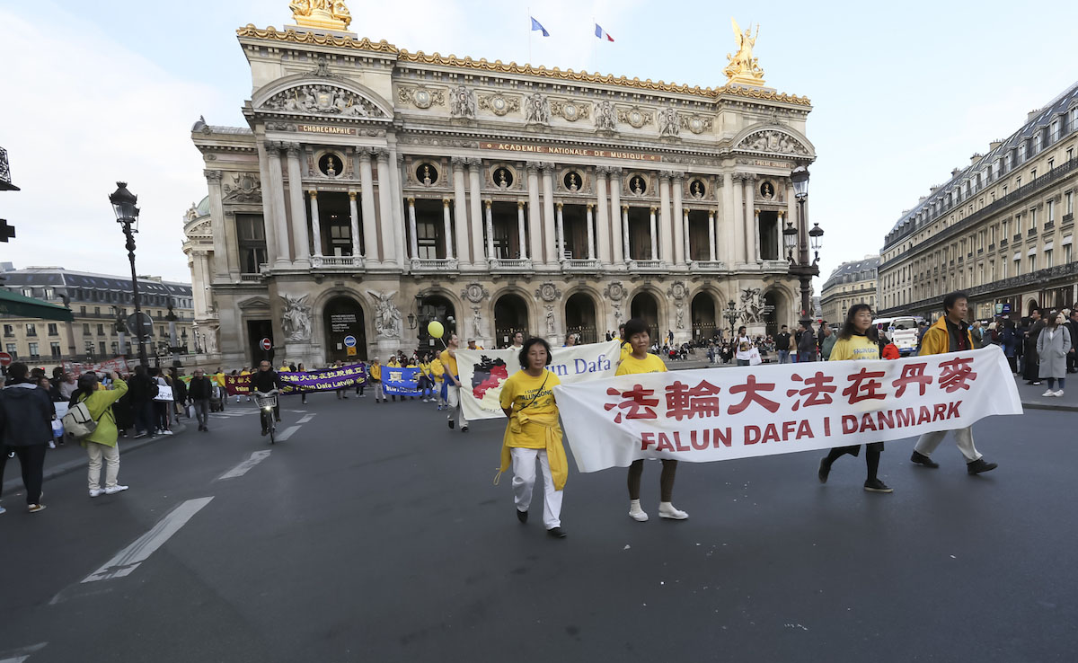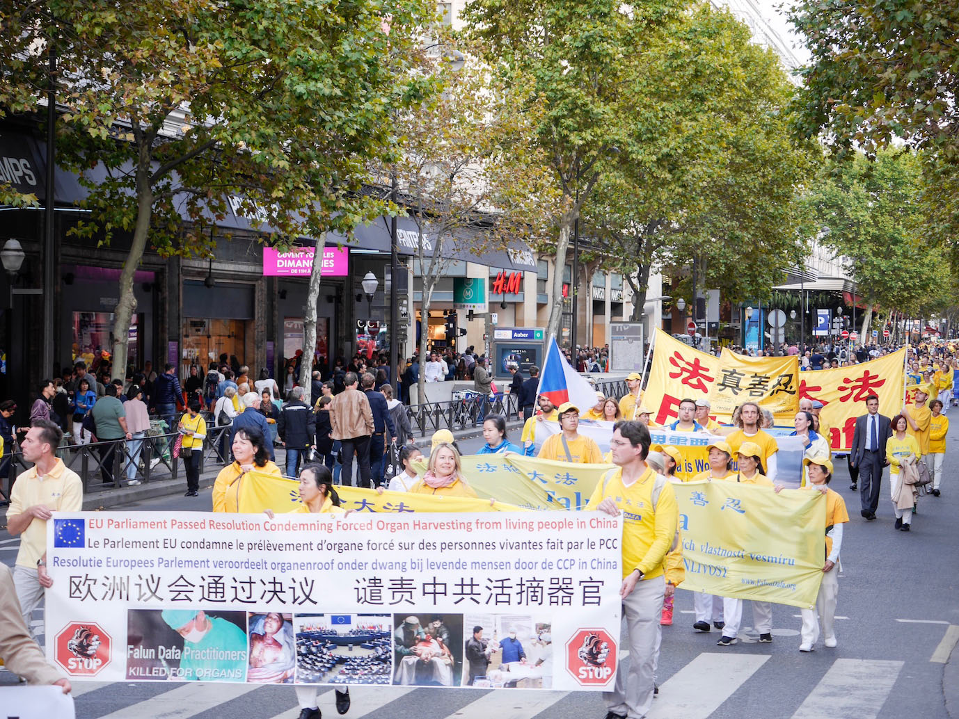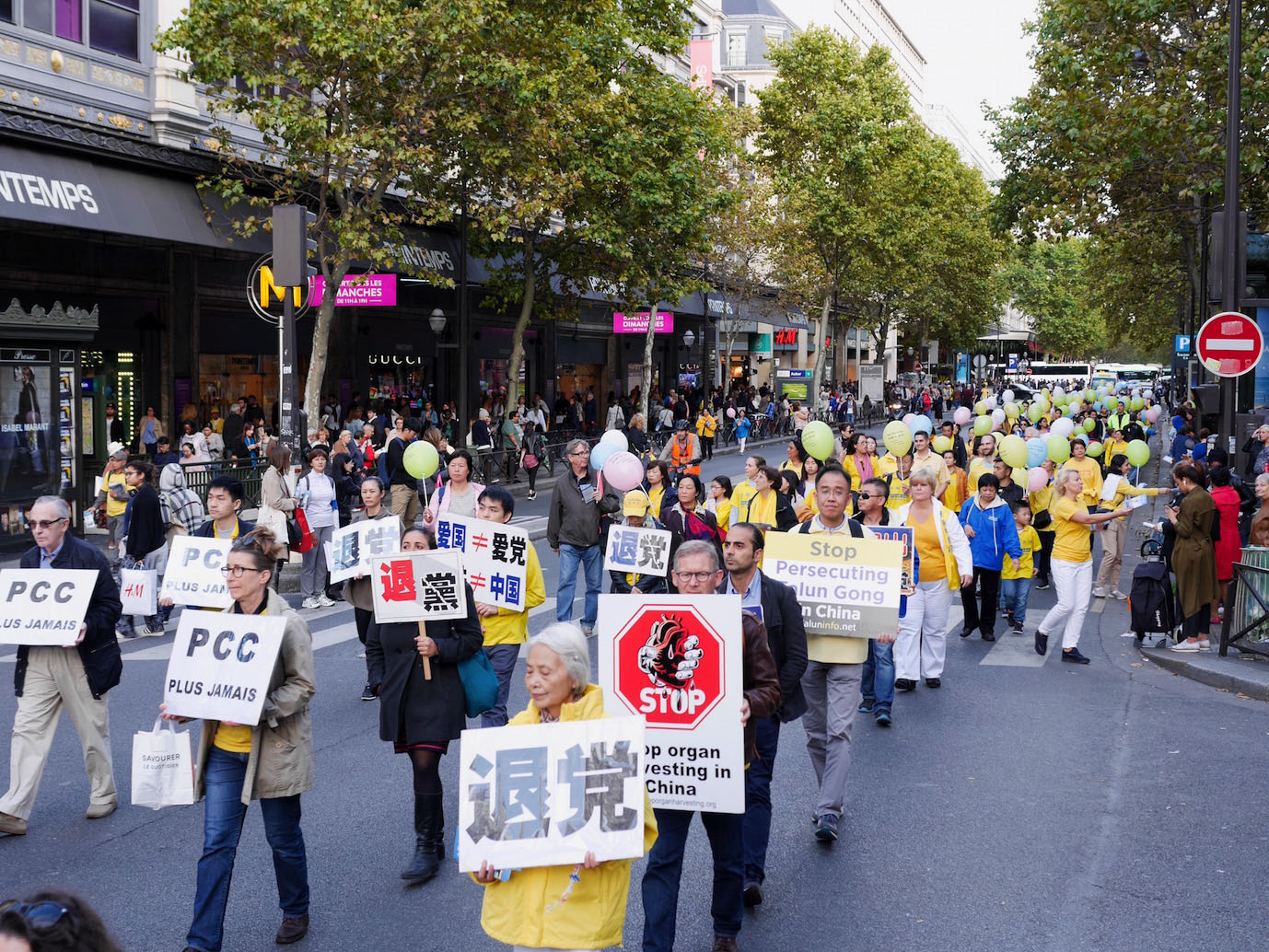 【明慧网二零一七年十月一日】(明慧记者德祥、德龙法国巴黎报道)二零一七年九月三十日下午五点,来自欧洲三十一个国家一千三百余名法轮功学员聚集在法国首都巴黎市中心 Place de la Bourse广场,拉开了大游行的序幕,游行队伍中包括《天国乐团》、腰鼓队、舞龙队、仙女队和功法表演,展现了法轮大法的美好。同时游行呼吁人们共同制止中共对法轮功长达十八年的迫害,包括手持被中共迫害致死的法轮功学员照片的队伍、揭露中共活体摘取法轮功学员器官的方阵以及退出中共。