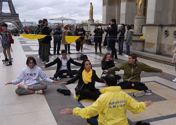 十月八日星期日,巴黎部份法轮功学员在艾菲尔铁塔下的人权广场,进行了介绍法轮功、讲真相和征集签名反迫害的活动。