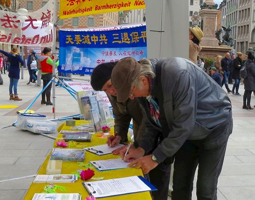 玛琳广场是市政厅所在地,可谓慕尼黑的中心,来往行人和游客络绎不绝。法轮功学员搭起的大型横幅在广场上非常醒目,很多民众驻足观看。不少人感到费解的是,中共为何要迫害如此和平的修炼人。通过跟法轮功学员交谈或当场阅读了有关资料之后,人们明白了中共的邪恶,之后纷纷在谴责迫害的征签表上签名。
