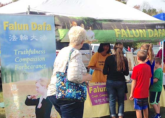 波士顿和罗德岛部份法轮功学员在麻州诺福克市秋收活动上传播真相,很多人走到展位前停下了脚步,或被莲花吸引,或主动来了解真相。