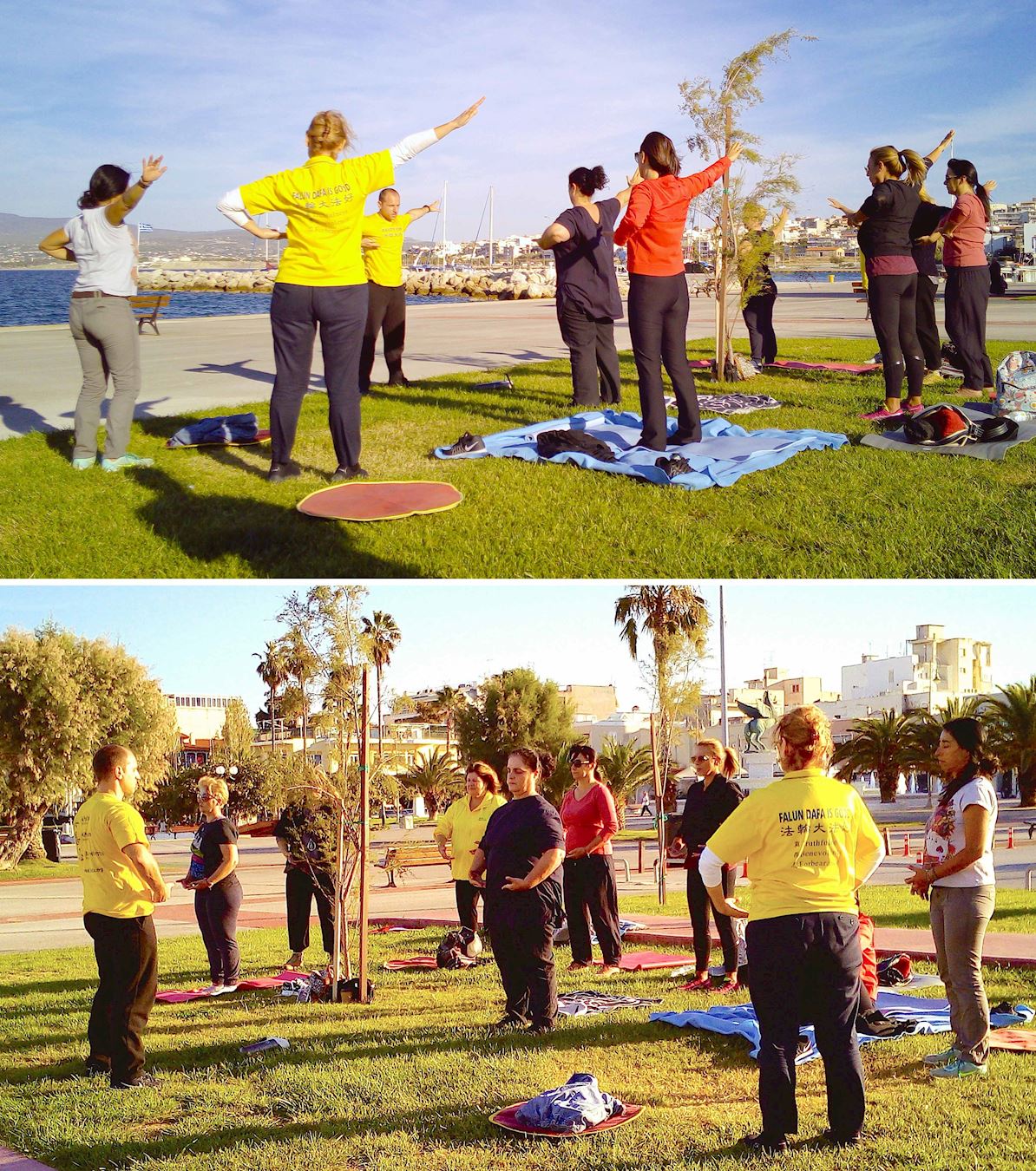 在Patra,学员把教授法轮功功法的信息发出去以后,十月十四日晨十点过后,陆陆续续近五十人前来学炼法轮功。海滩上飘扬着优美的炼功音乐,吸引了众多游人,炼功点旁的真相横幅前,不时有路过人群驻足了解详情,主动拿传单,有些人干脆走近教功点仔细观看,也有人看着看着就走到外围跟着学炼功法。不少学炼功法的人多要了些真相传单,说是给朋友也送去。