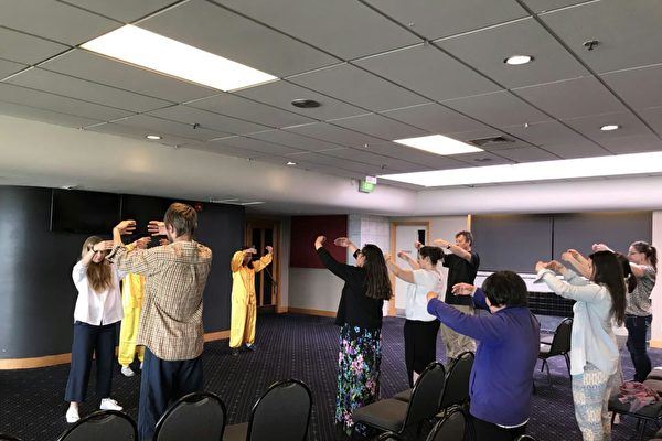 活动两天期间,天气晴朗,春光明媚,三层楼的会展中心人群熙熙攘攘,人来人往,络绎不绝。法轮大法的展位区域被学员们精心布置的简洁大方,色彩明亮。桌子上放置了法轮大法书籍,和学员们自己亲手制作的小莲花和书签,以及法轮大法的介绍资料。同时也准备了电脑循环播放配有英文解说的教功录像。在活动内容上,一部份学员轮流不间断的炼功,展示功法,另一部份学员负责向民众解说和答疑。此外,学员们还申请了约一个小时的学炼法轮功的场地,和感兴趣的民众一起炼功。
