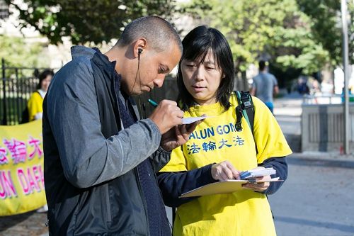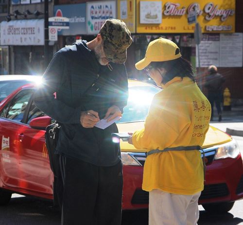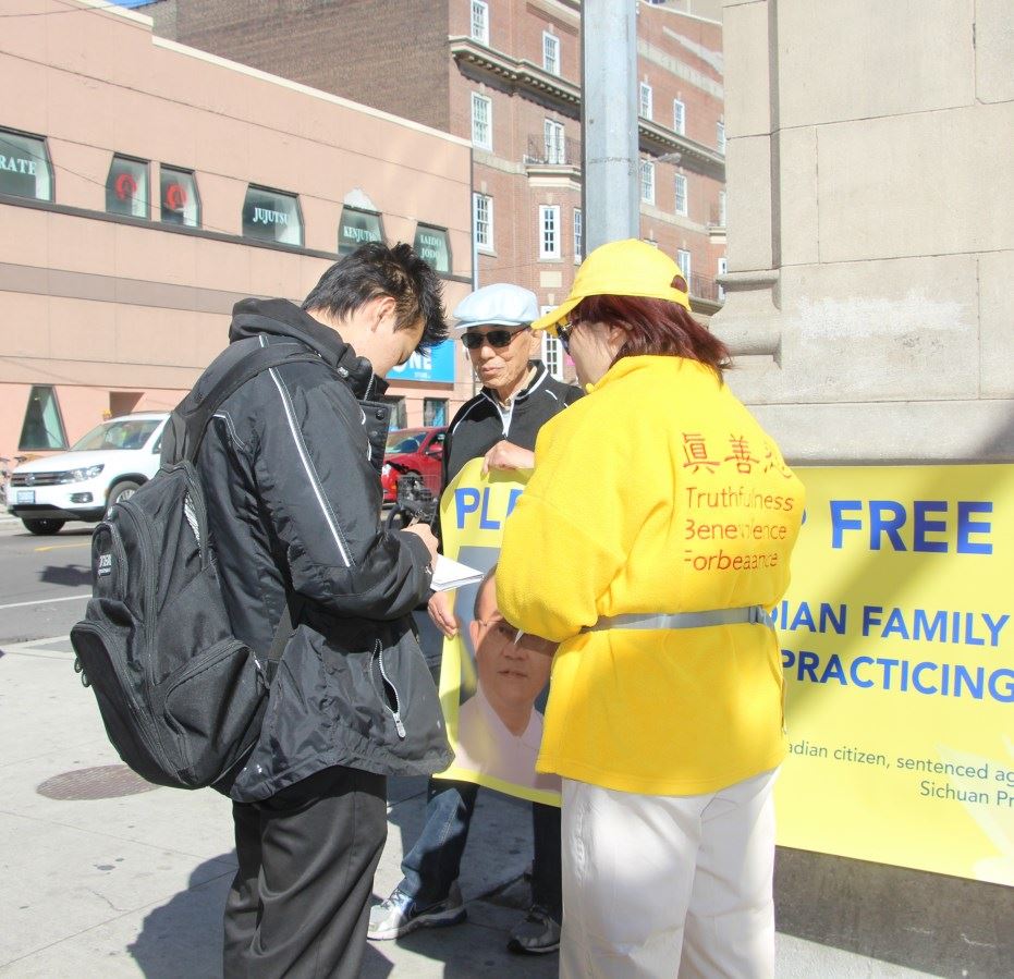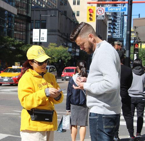 9月30日,多伦多市中心的33个大街的十字路口,站满了穿着黄色T恤的法轮功学员,他们拉着“法轮大法好!”和“营救在中国受迫害的法轮功学员”的横幅,向路人讲法轮功受迫害的真相,民众纷纷在给总理的征签卡“Please help free Canadian families”上签名。有市民签完名后流着泪拥抱法轮功学员说:“祝你们幸运!”有的拿了好多的空白征签卡,说一定会找人签完寄到加拿大总理贾斯汀·特鲁多的手里;有的提建议要更多地举行这种活动,让更多人知道,一起来制止这场无人性的迫害。