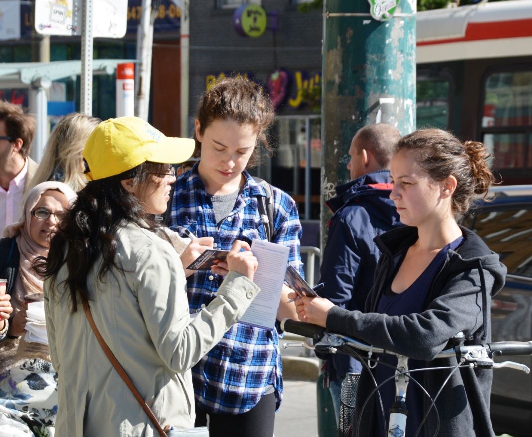 在活动现场,有四位来自中国大陆的学生经过,现在多伦多大学读书。了解到法轮功真相后,有两位大学生很爽快地同意退出曾经入过的共产党及其组织。他们都在征签卡上签了名。