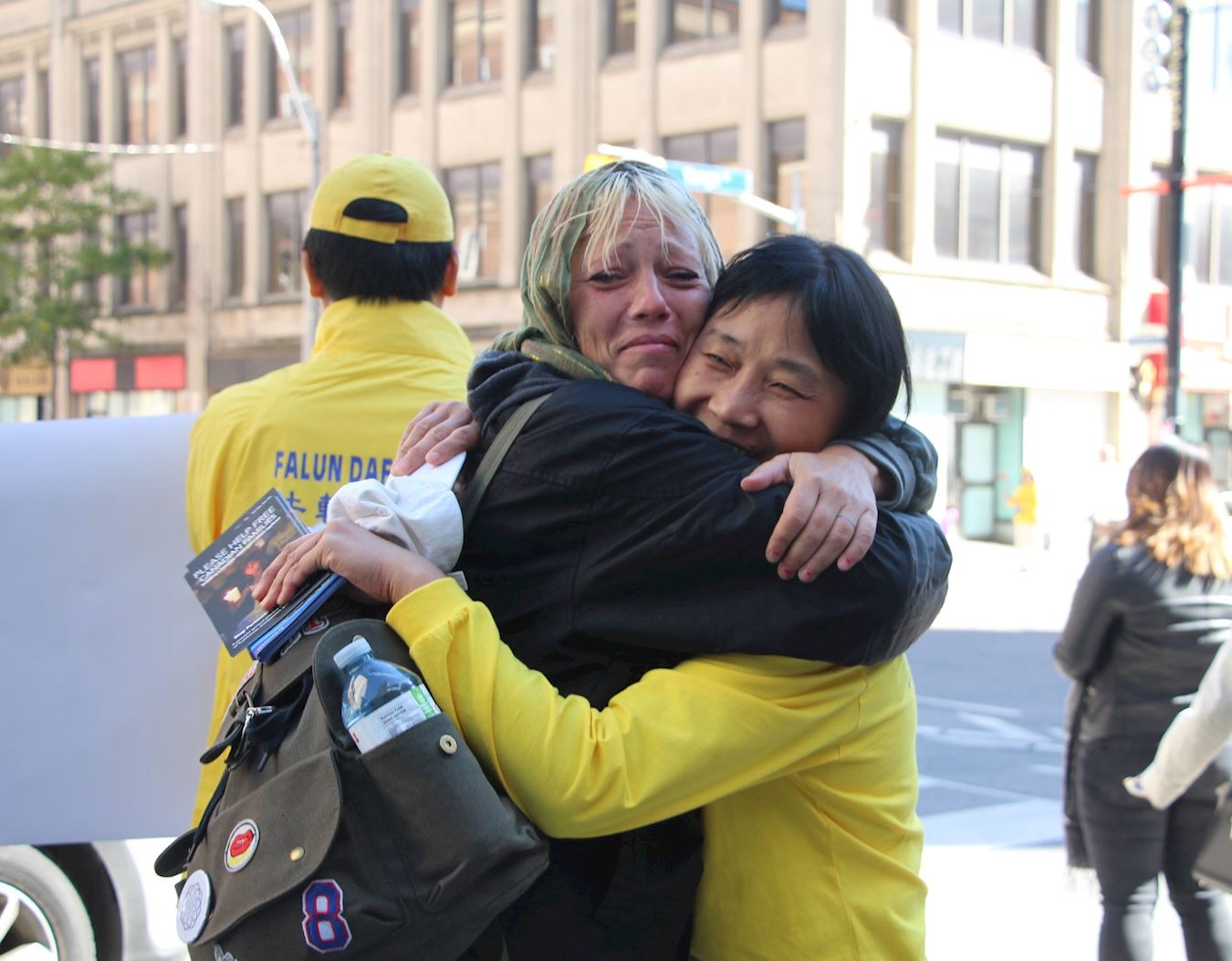多伦多居民Patricia Dwyer在Yonge & Gerrard 的路口遇上了法轮功学员,她了解到今天的活动是呼吁营救在中国受迫害的法轮功学员,她激动得流泪满面,她拥抱着法轮功学员说:“尽快把他们营救出来,人是应该有自由和人权的,怎么能因为炼功就要被迫害和受酷刑呢?!这是什么世道啊。”