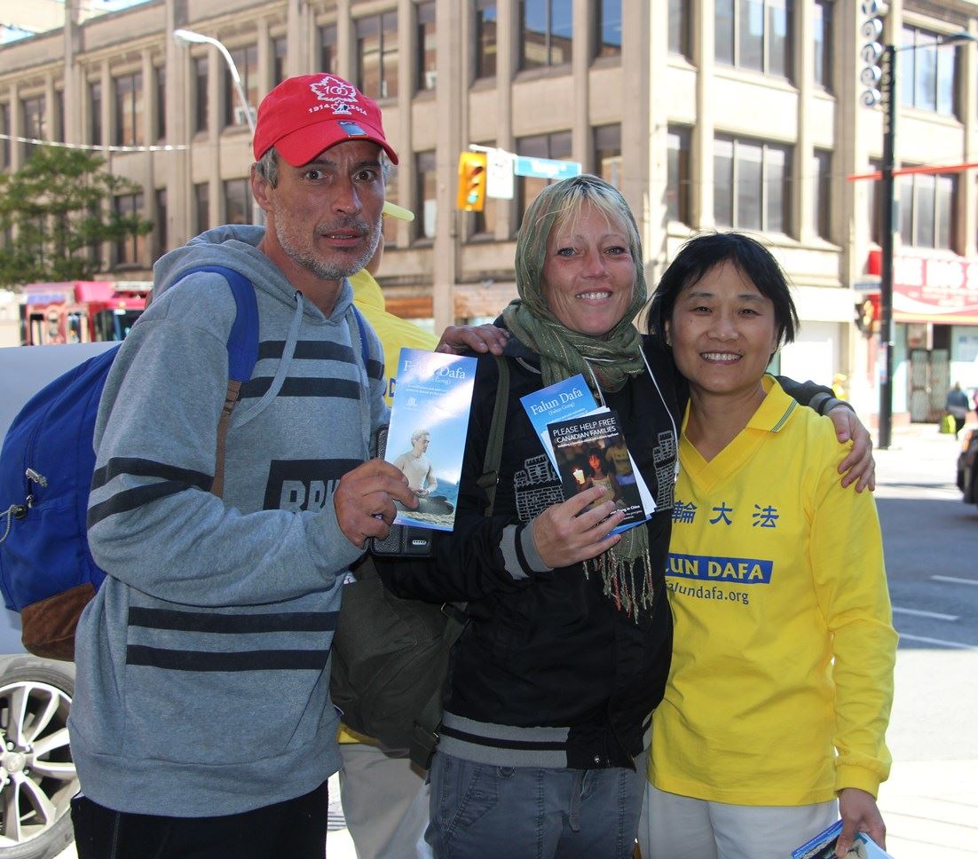 图8:多伦多居民Patricia Dwyer(中)和她的朋友Richard Hearn与法轮功学员合影。他们拿了一叠的征签卡表示回去一定告诉更多的人签名支持。