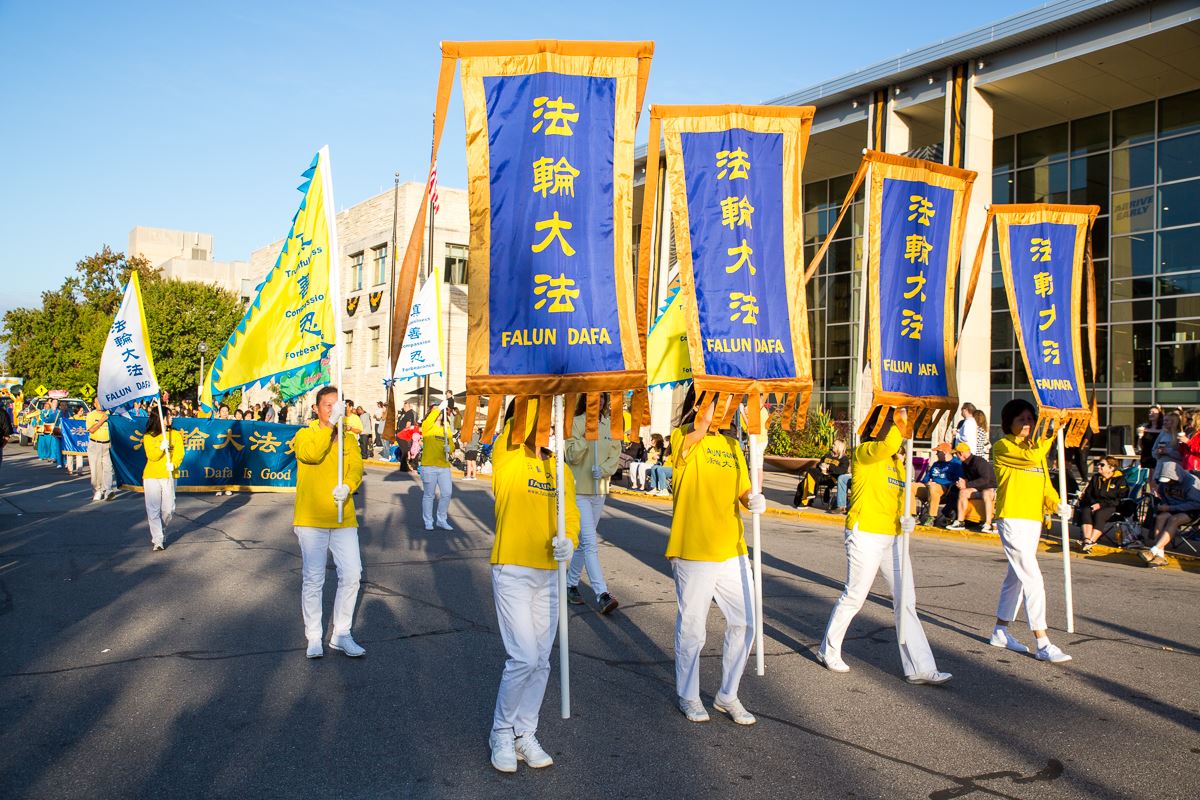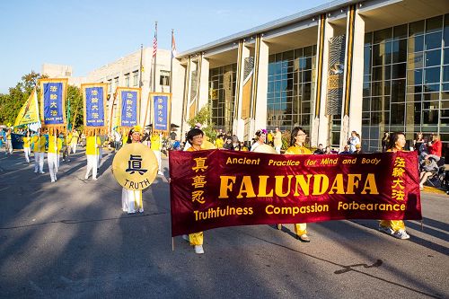 【明慧网二零一七年十月二十二日】2017年10月21日,法轮功学员参加了美国密苏里大学哥伦比亚分校一年一度的返校节游行。密苏里大学的返校节始于1911年,是全美最大的返校节庆祝活动之一。今年的游行有超过130个团体参加。预计有超过一万人从各地赶来参加返校节活动。