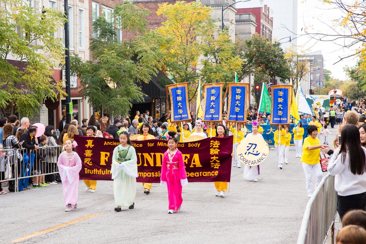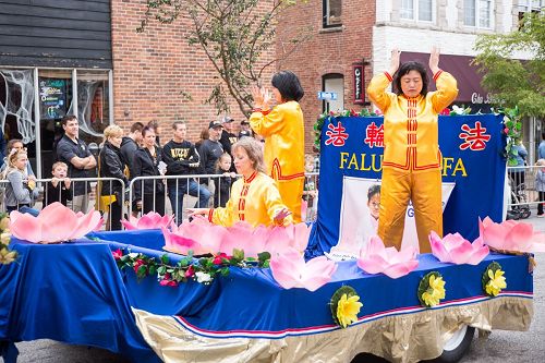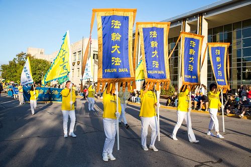 法轮功学员的游行队伍丰富多彩,有身着汉服的小仙女,穿着蓝色炼功服的唐鼓队,还有花车紧随其后。印有“法轮大法”和“真善忍”的旗帜随风飘扬。很多观众都对法轮功学员的游行队伍报以热情的欢呼和掌声。一些华人留学生和家长也对在返校节游行中见到法轮功充满惊奇,纷纷拍照,有的还挥手致意。