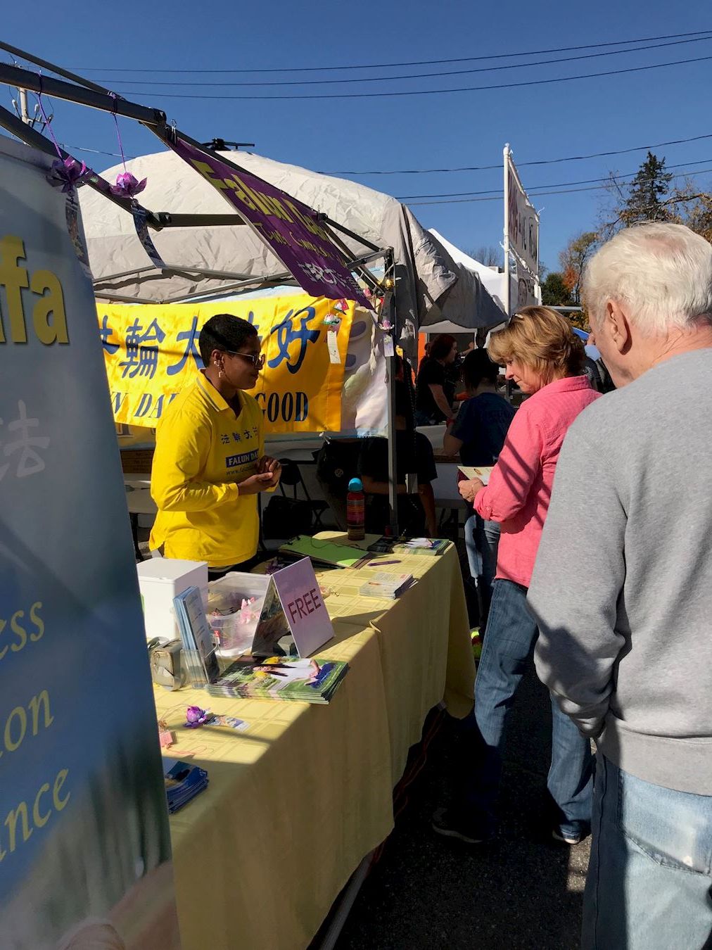 在威斯敏斯特(Westminster)的秋季“Cracker Festival”节上,法轮大法的展位聚集了有缘的民众,在明白了真相后,纷纷要求炼功。