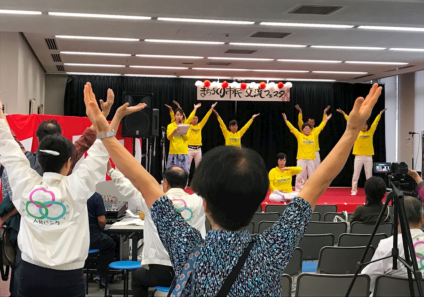 法轮功学员在展位上摆放了介绍法轮大法的资料,也准备了电视循环播放配有日文解说的教功录像,感兴趣的民众可以随时学习、体验功法。另外,在室内及室外的舞台表演中,法轮功学员展示了五套功法,伴随着音乐,现场很多观众都跟着一起炼了起来。