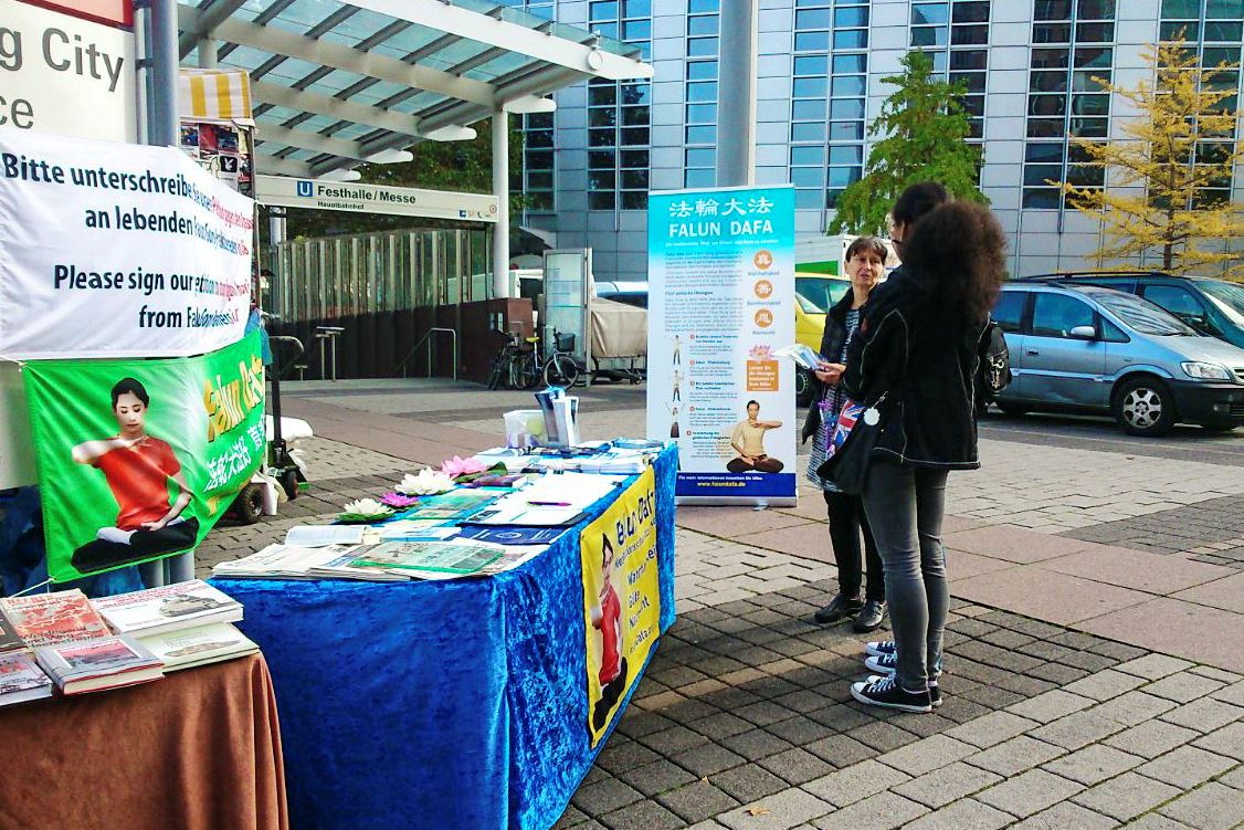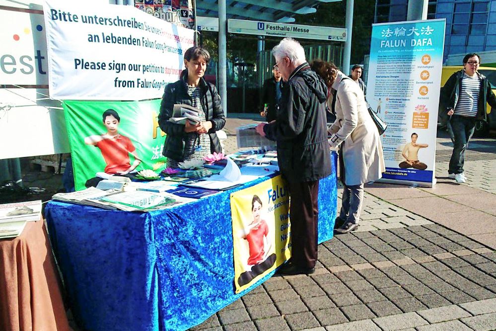 展出的五天期间,法兰克福的法轮功学员在会展中心的主入口和法兰克福市中心同时设立了展位,向来自世界各地的参展者和参观者介绍法轮功,揭露中共的迫害,并介绍法轮功学员和平抗争的历程。活动吸引了人们的关注,也让来自中国大陆的人士有机会了解了真相,其中一些人当场做了退出中共各类组织的声明。