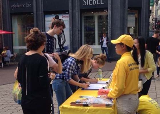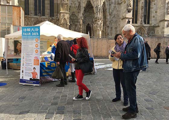 法轮功学员在德国南部古城雷根斯堡举办信息日,很多德国人了解法轮功真相后,马上在反活摘征签表上签名。